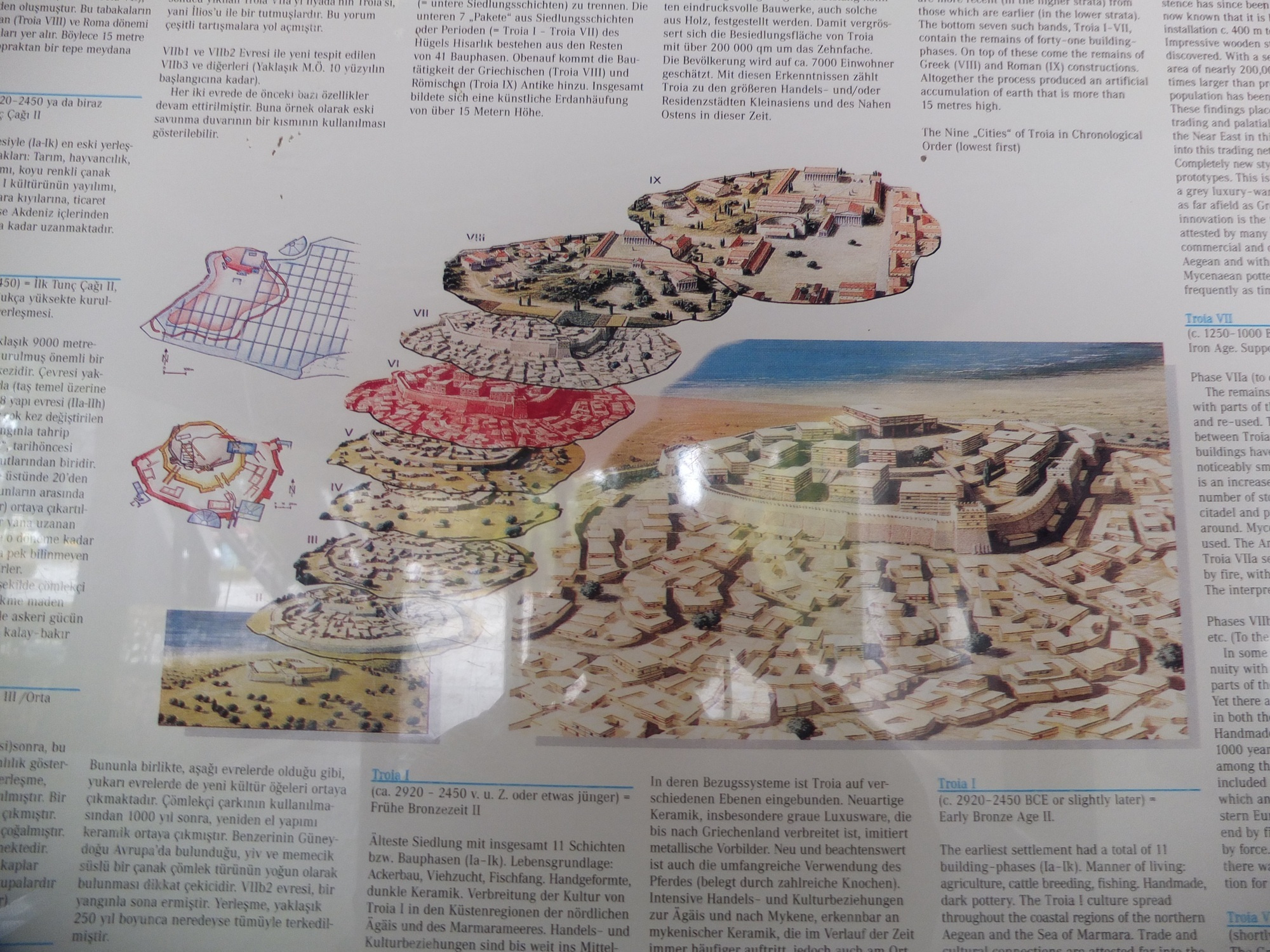 トロイのあの有名なお話はもちろんご存じだと思うが、あの話は作り話だと思われていたところが、一人のドイツ人シュリーマンが絶対にトロイは存在した!そこに財宝が眠っているに違いない!と、探しに探し、ついに見つけたのがこのトロイ。(*最初にこの遺跡を見つけたのはアマチュア考古学者フランク・カルヴァートだそうだ)しかし、発掘の仕方がめちゃめちゃだったため、年代がぐちゃぐちゃになってしまい、しかもひそかに発掘品を持ち帰ってしまっとか・・・なので、今まだ全容が解明されない。そもそも、街が何らかの理由で廃墟になってしまうと、そこを埋め、その上に新たな街を作るという方法がとられてきたため、何層にもなっていて(下の説明版参照)、それが混ざってしまったため、解析が困難になってしまっているそうだ。