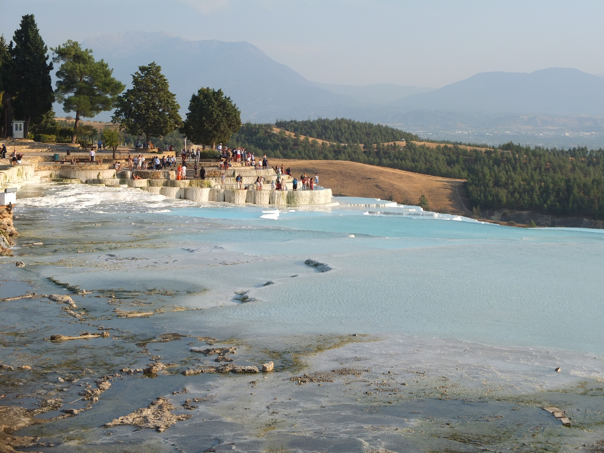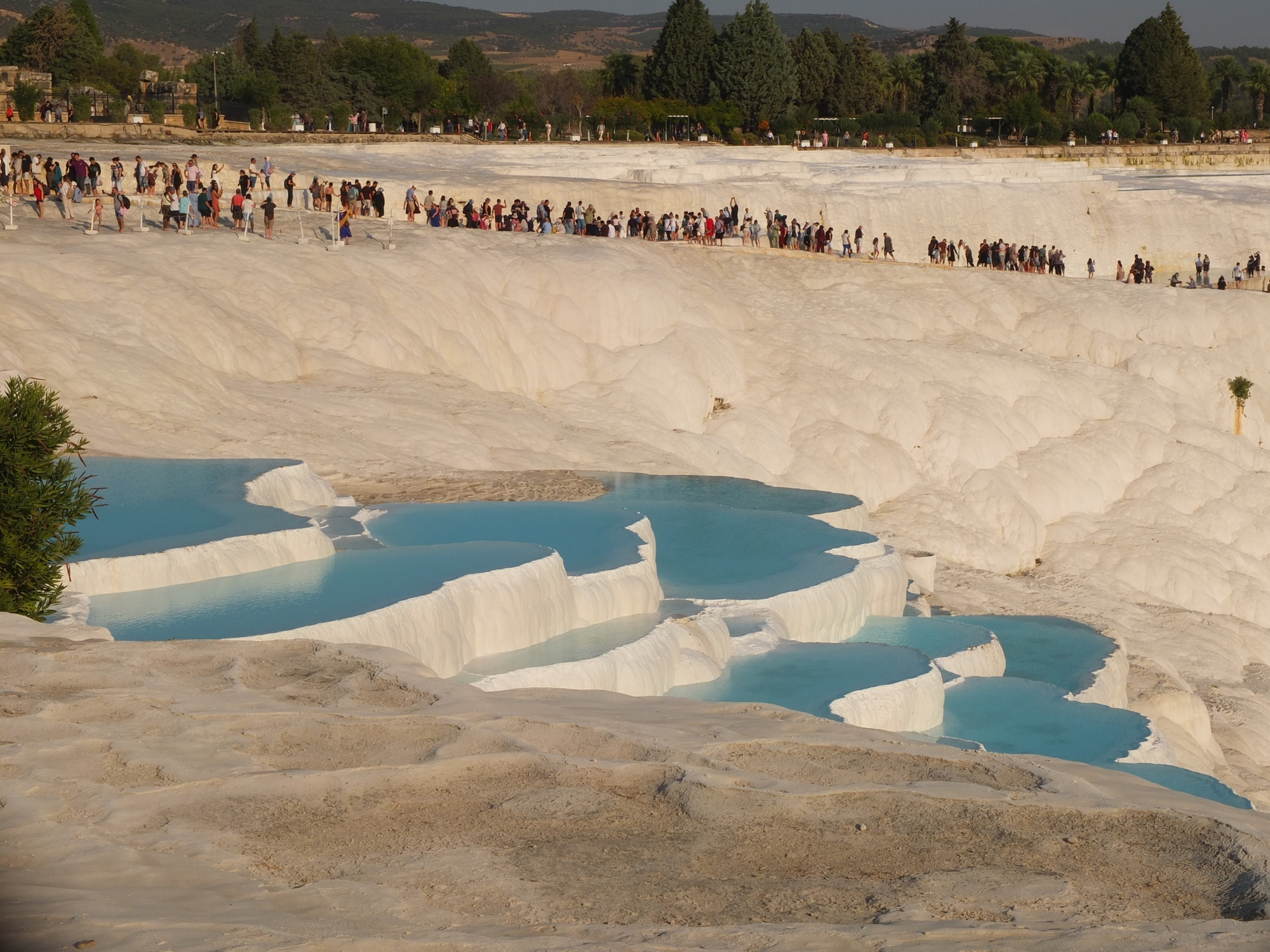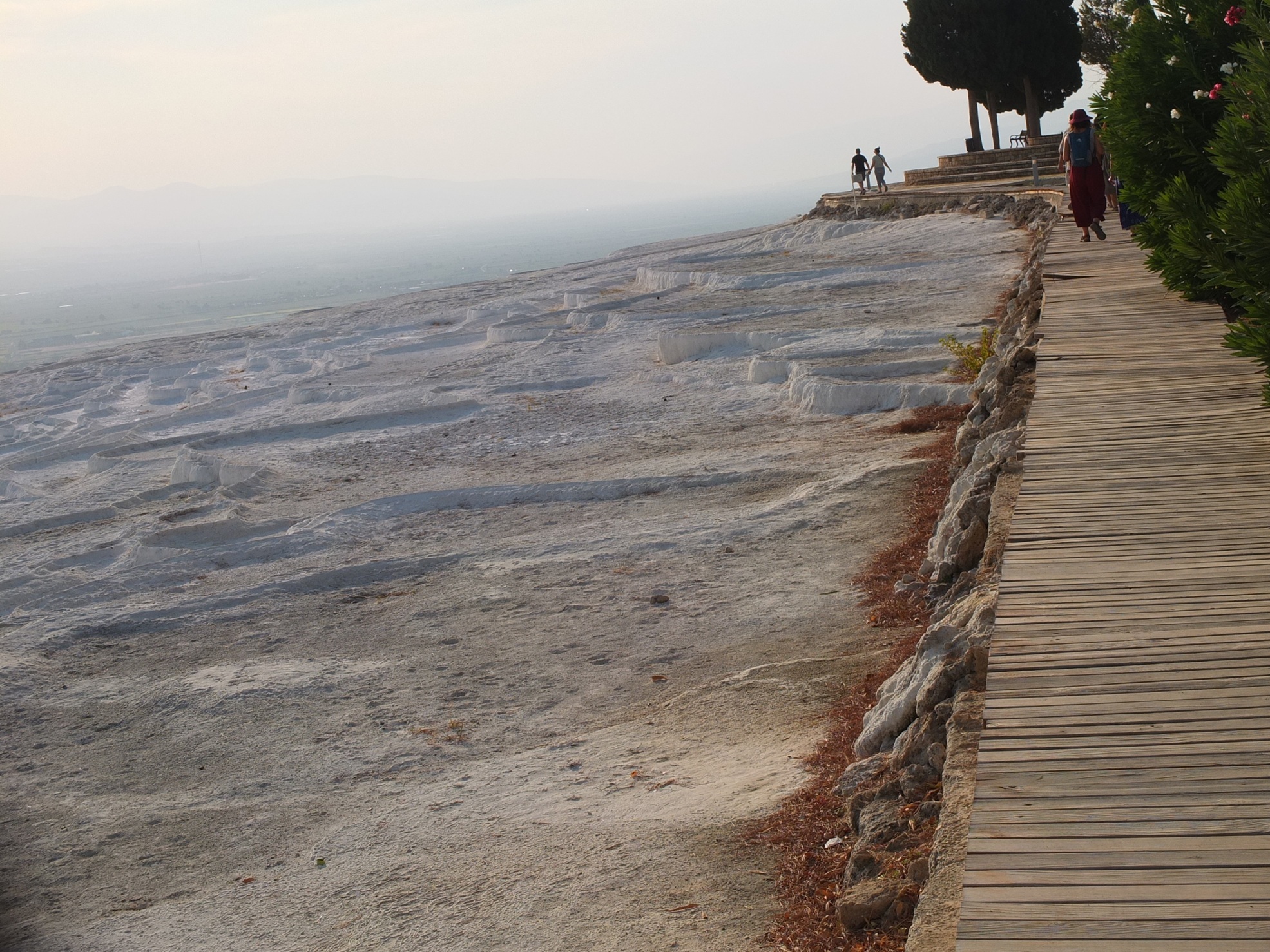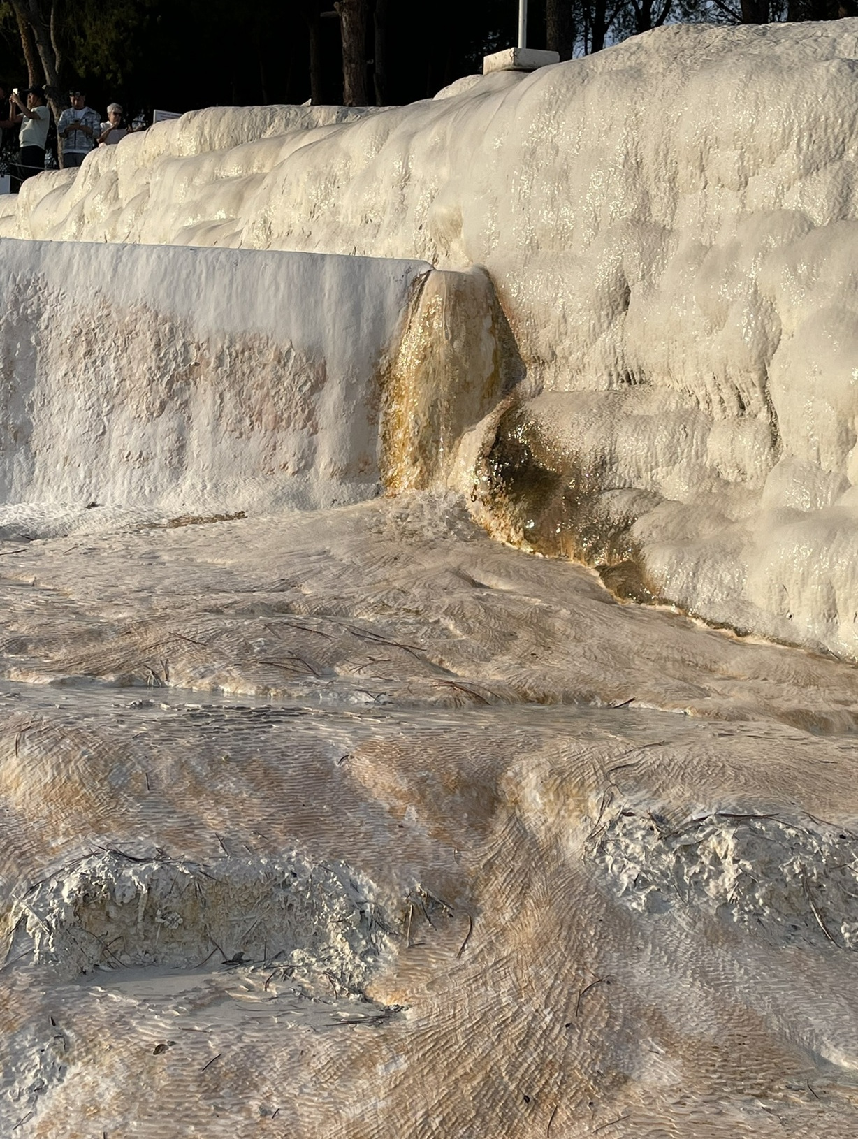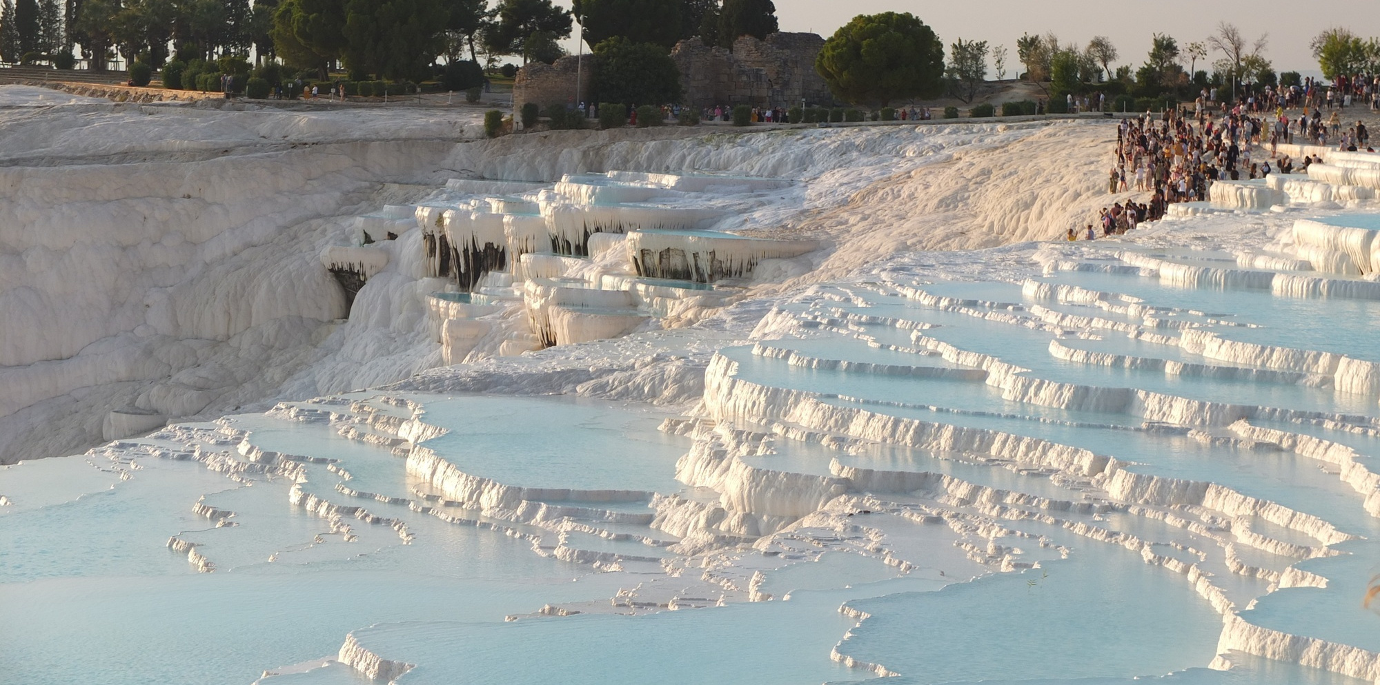 遺跡の残る大地を10分ほど歩き、パムッカレの段丘に到着。すでに夕方の5時を過ぎていたので、ちょうど夕日が当たってきれい!でも、手前の方は、水が無いときの影響か、白くないところが目立つ。