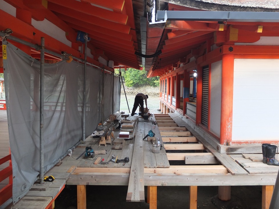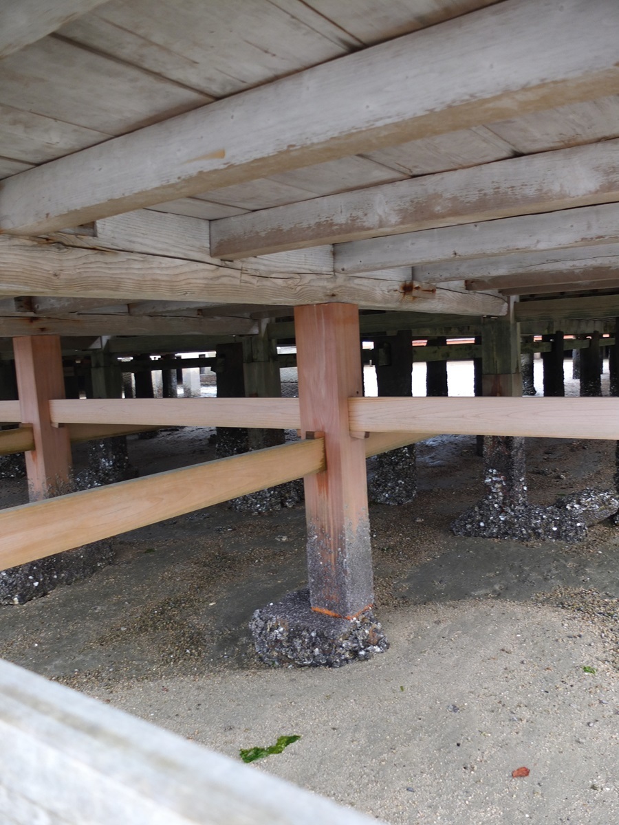 令和元年(2018年)6月から行われていた大鳥居の大改修工事の終了まじかだったので、覆いが取れ、まだ工事用の桟橋が残っており、その桟橋を渡って鳥居の真下まで行くことができる貴重な期間でした。もちろん、潮が引いた時には徒歩で真下まで行けるのですが、潮が満ちた状態で鳥居の真下に行くことができるのはこの期間のみだろうと嬉しくなりました。
