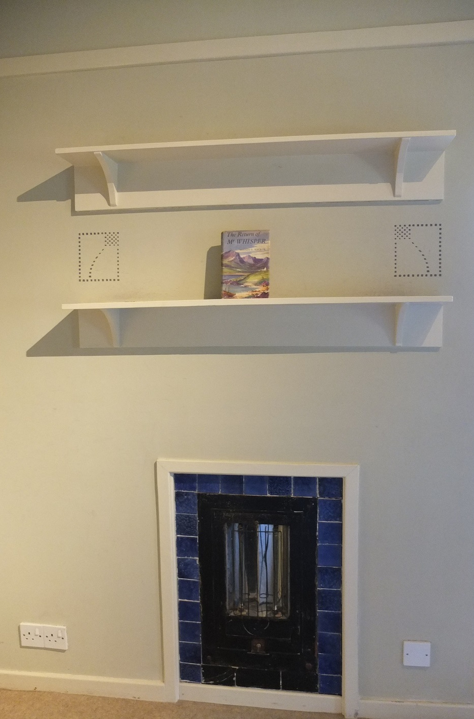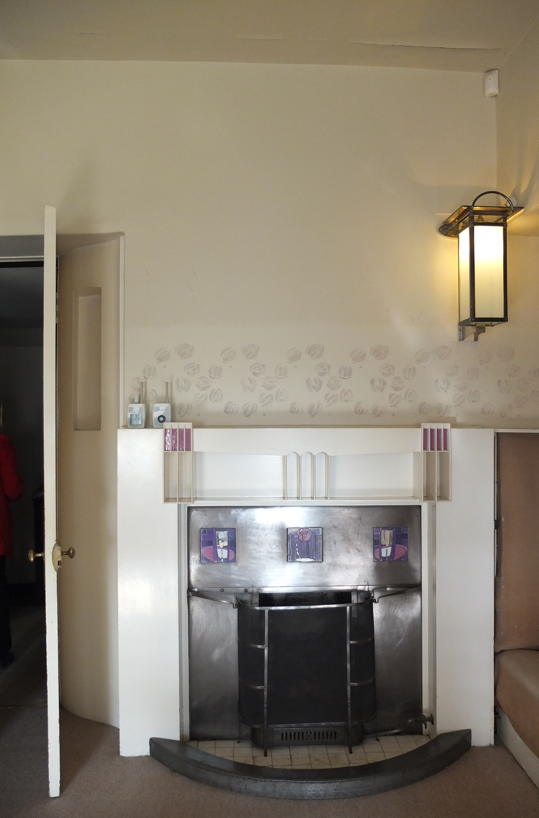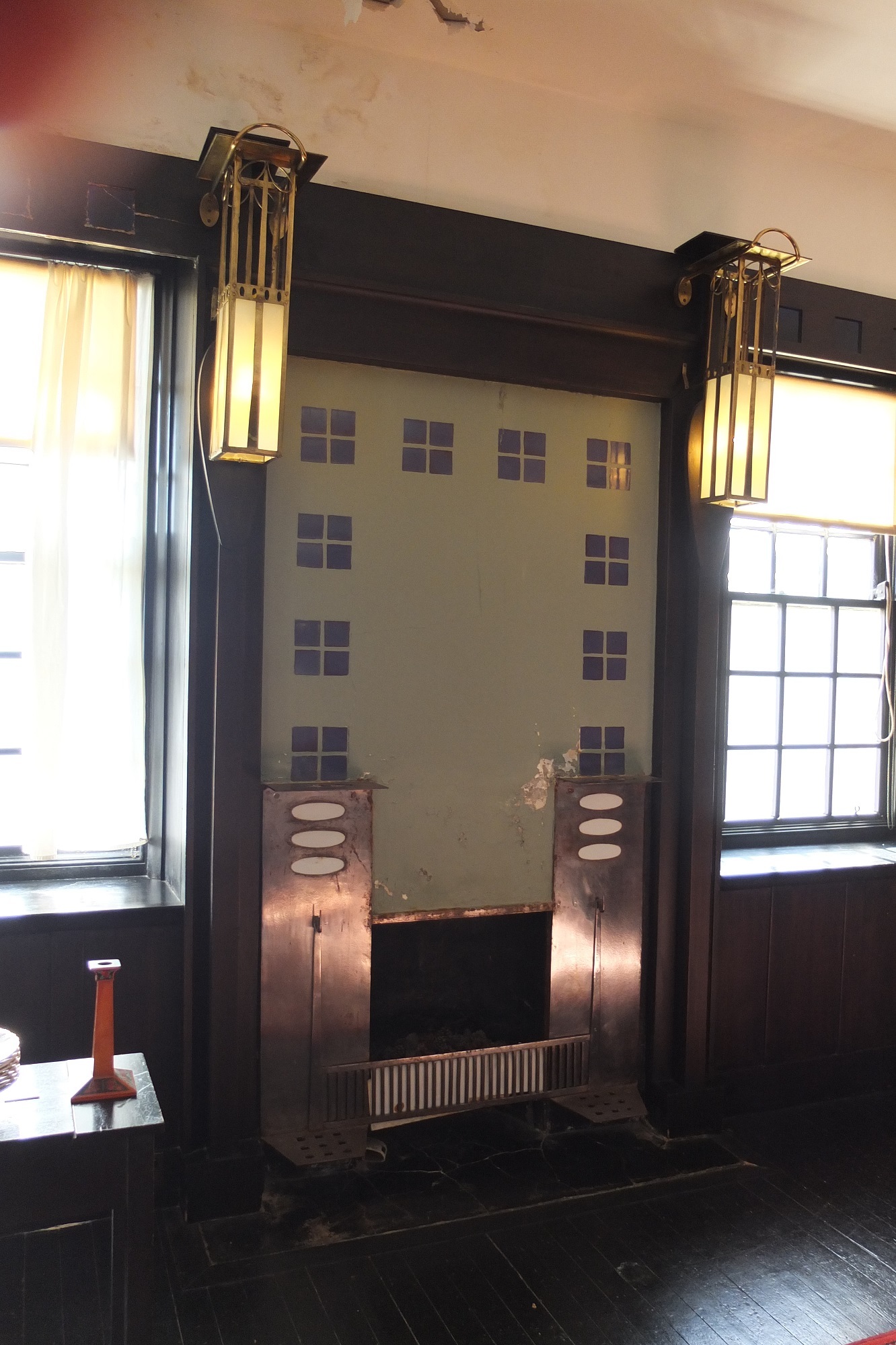 壁を凹ませた中に組み込まれた暖炉。サイドの棚もきっちりデザインされている。よく見ると、暖炉の装飾、左右対称ではないことがわかる。マッキントッシュはなぜか左右対称に見えるところを必ずちょっと崩している。しかも、よく見ないと気が付かないように。
