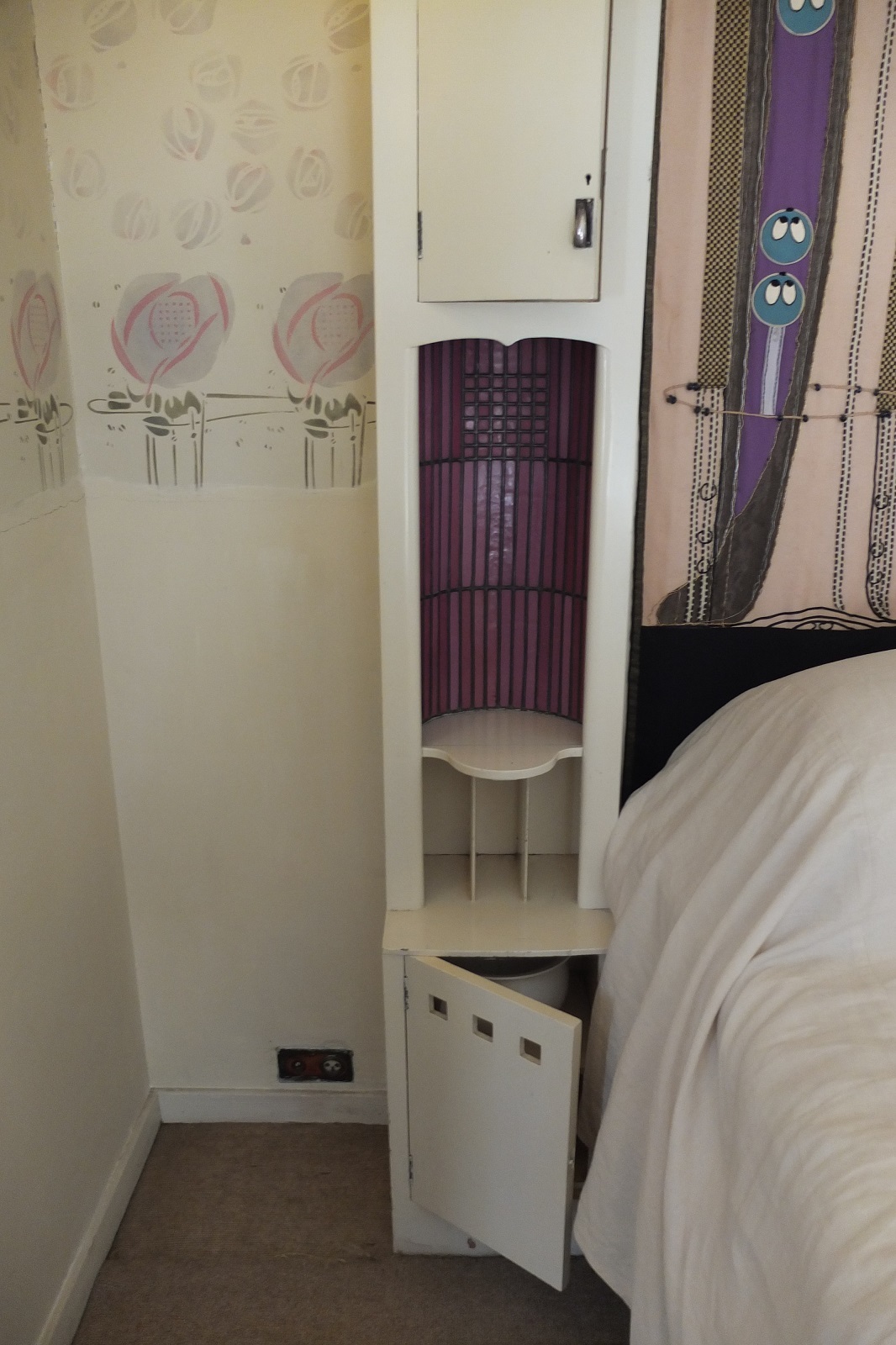 ベッドの足元側のスペース。暖炉、化粧台(?)収納が有る。暖炉の横には小さなにっちのソファが有り、ここで暖をとったり、くつろいだりしたのだろうなぁ…