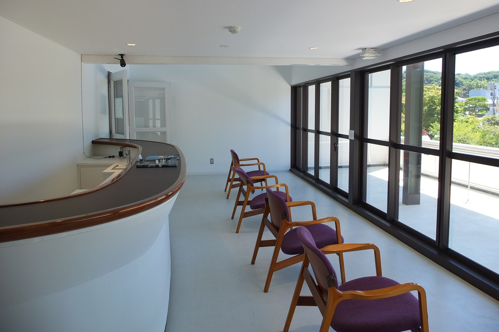 中庭と回廊を隔てる壁は大谷石。この壁も穴あき。穴の部分にガラスブロックが入った部分もあるが、受付のある空間と中庭を仕切るこの壁は穴のまま。鉄格子といい、この壁といい、仕切りたくないんだなぁ・・・天気の悪い日はどうする?・・・まぁ、壁の無い部分が半分あるから、もういいか・・・って?