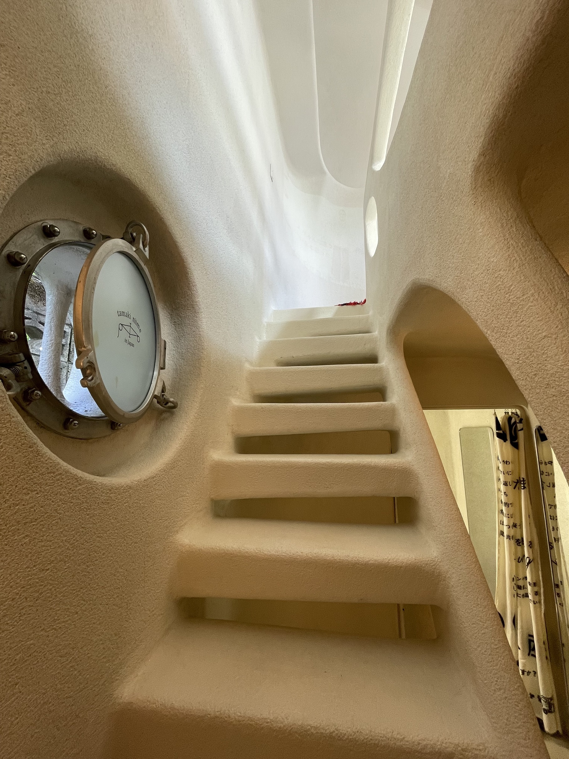 ガラスの向こうはバルコニー。白い大きなお団子を敷き詰めたような床。ここから屋上へ。
