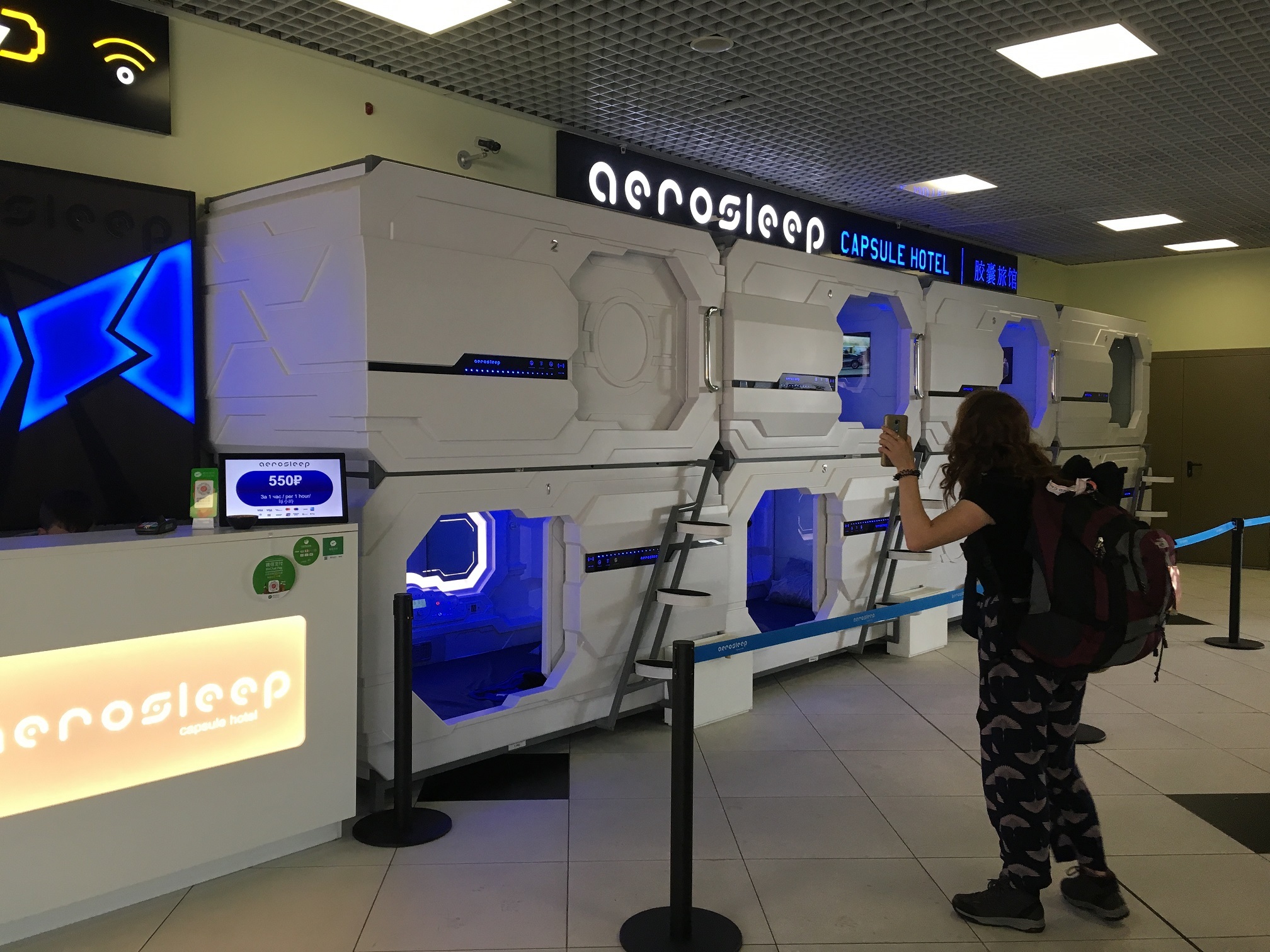 通路のわきに日本でいうカプセルホテルのカプセルが置かれている。2段に積まれたカプセルのわきには受付デスクが!カーテンを開ければすぐ通路というこの状況・・・日本では考えられない!
