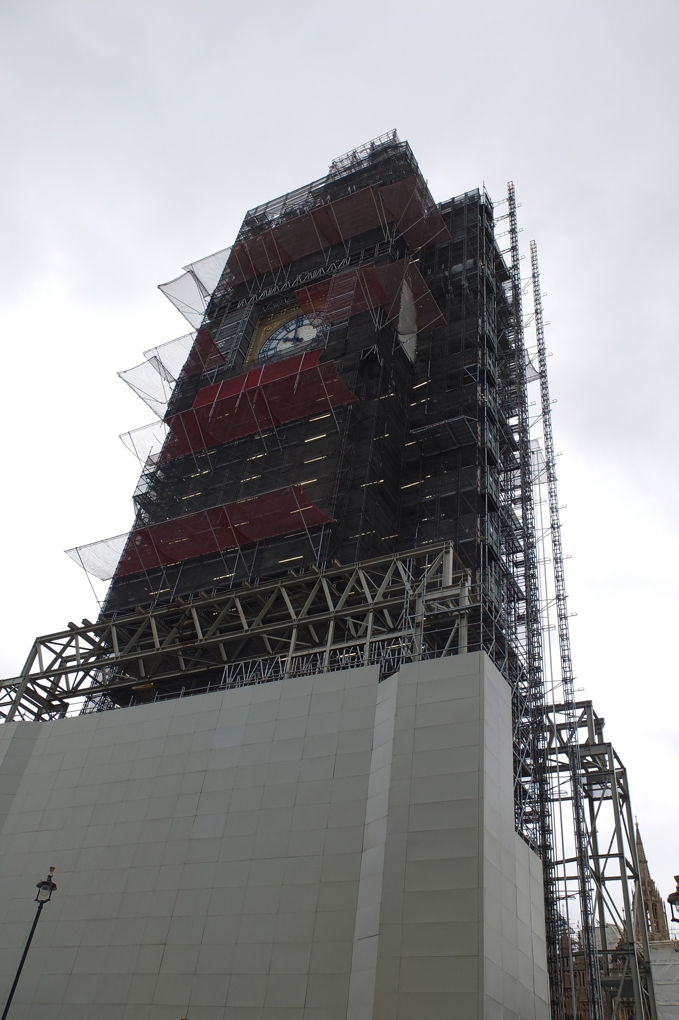 2日目の始まりはビッグベン(国会議事堂)から。ウェストミンスター駅を出るとすぐ目の前に出てくる。しかし、今は改修工事中でこんな姿。