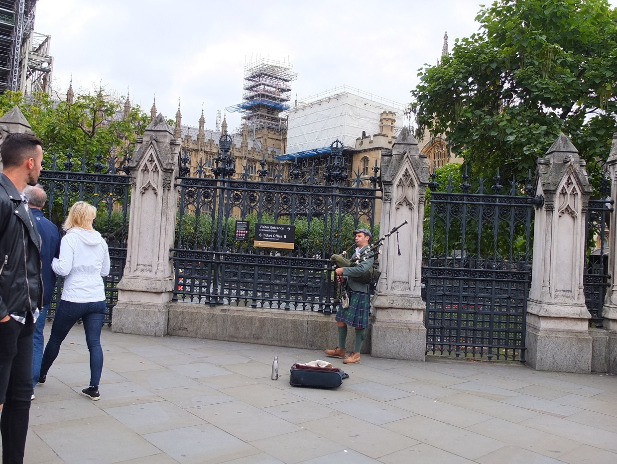 ビッグベンの塀の前でバグパイプを演奏している人がいた。イギリスの観光地では時々見かける。20数年前に来た時も、ロンドン郊外の街で見かけた。その時は例のチェックのスカートの衣装を着た人だった。