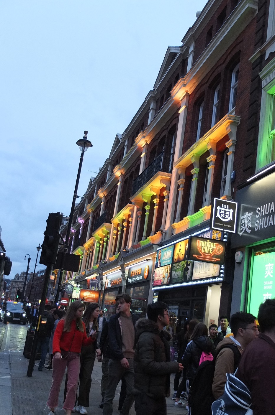 昼食後、ピカデリーサーカス区に向かって街を散策しながら歩いていくと、張り出した庇にさりげなく劇場名が!想像していたのとちょっと違う・・・。帝国劇場的なものを想像してたら、日生劇場位な感じ。