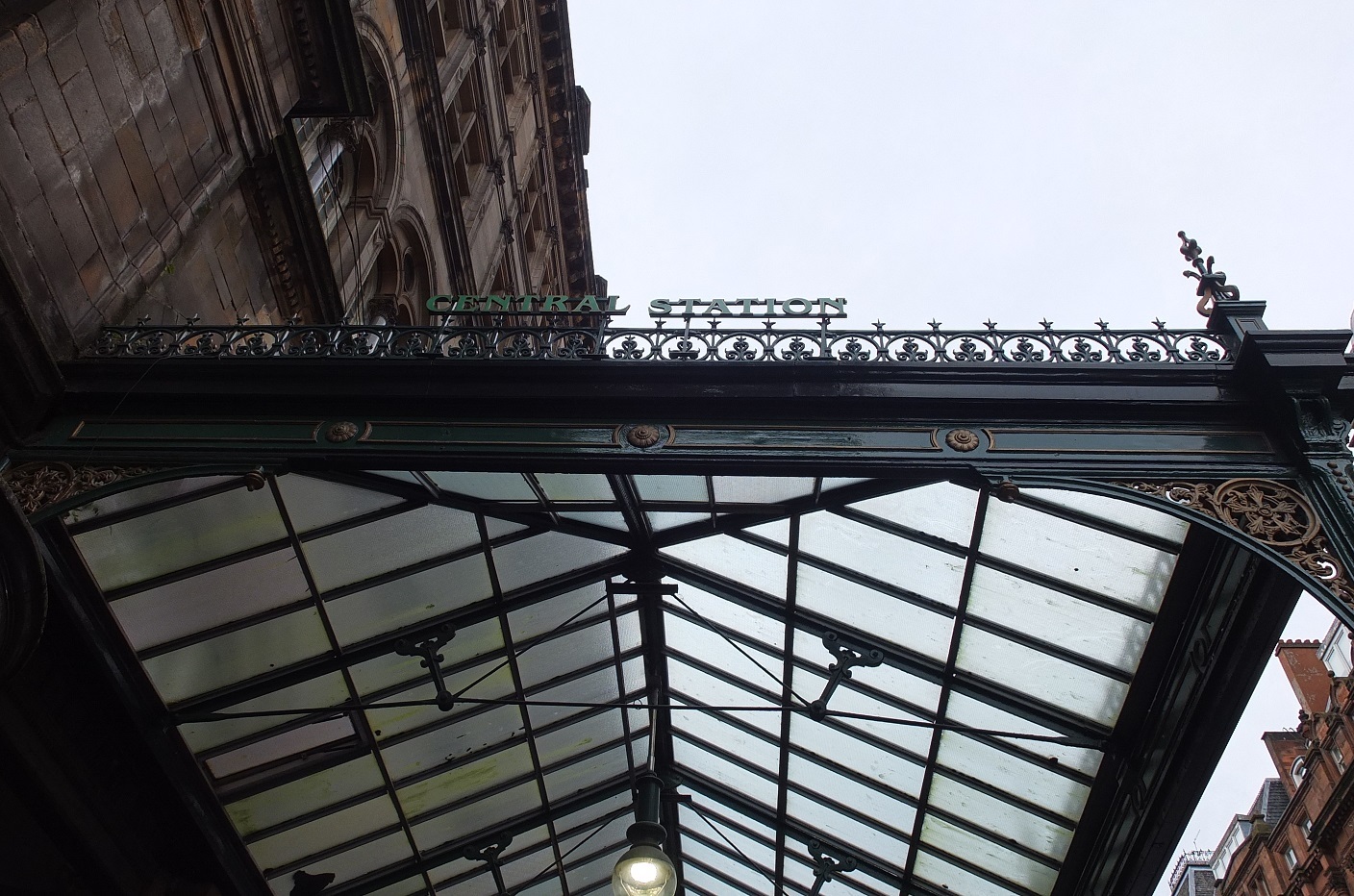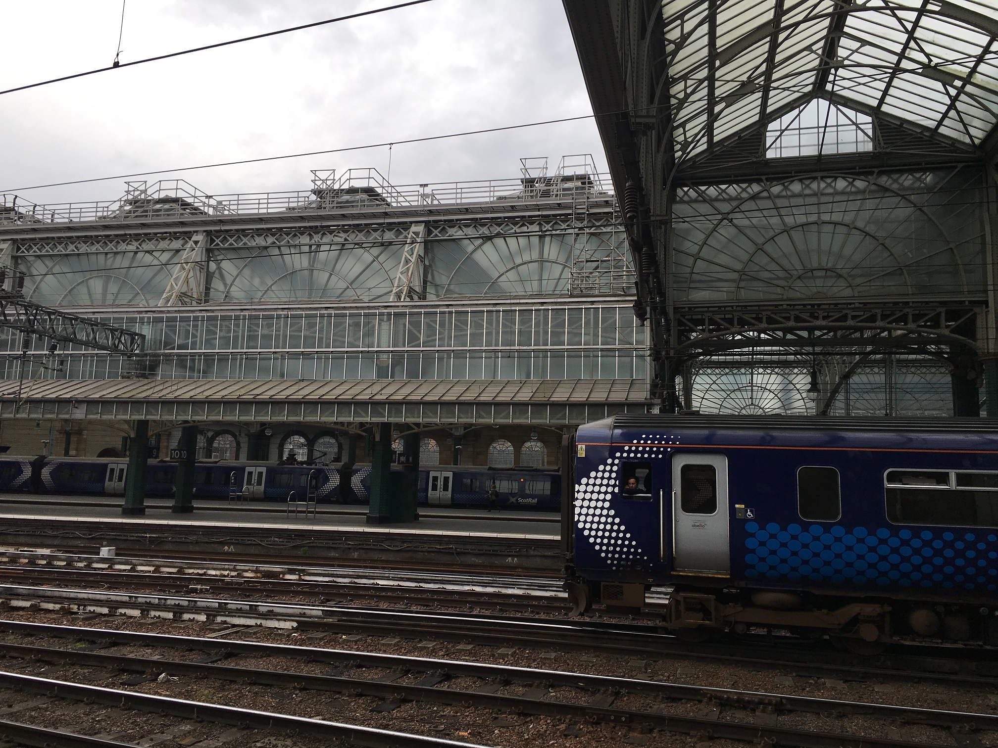 ガラス張りの屋根のホームに列車が滑り込み、グラスゴーセントラル駅に到着。いかにも外国に来た!という感じの駅。産業革命の頃に建設されたんだろうかと思わせる造りだ。
