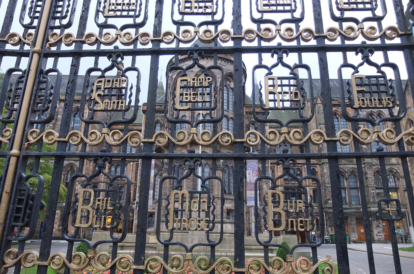 よく見ると塀(鉄柵)に文字が有る。調べてみたら、これらは、グラスゴーに関わりのある人たちの名前だった。「ADAM SMITH」・・・卒業生、道徳哲学者、教授 「REID」・・・アダム・スミスの後任教授 「CAMBELL」・・・卒業生、政治家。