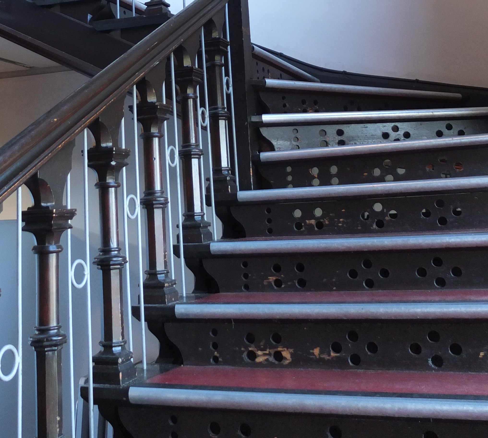 柱なんて、こんなかわいい装飾がされているのに。手摺だって、無機質じゃないのに・・・天井が構造むき出しのせい??いやいや、教会だってそういうのあるし・・
