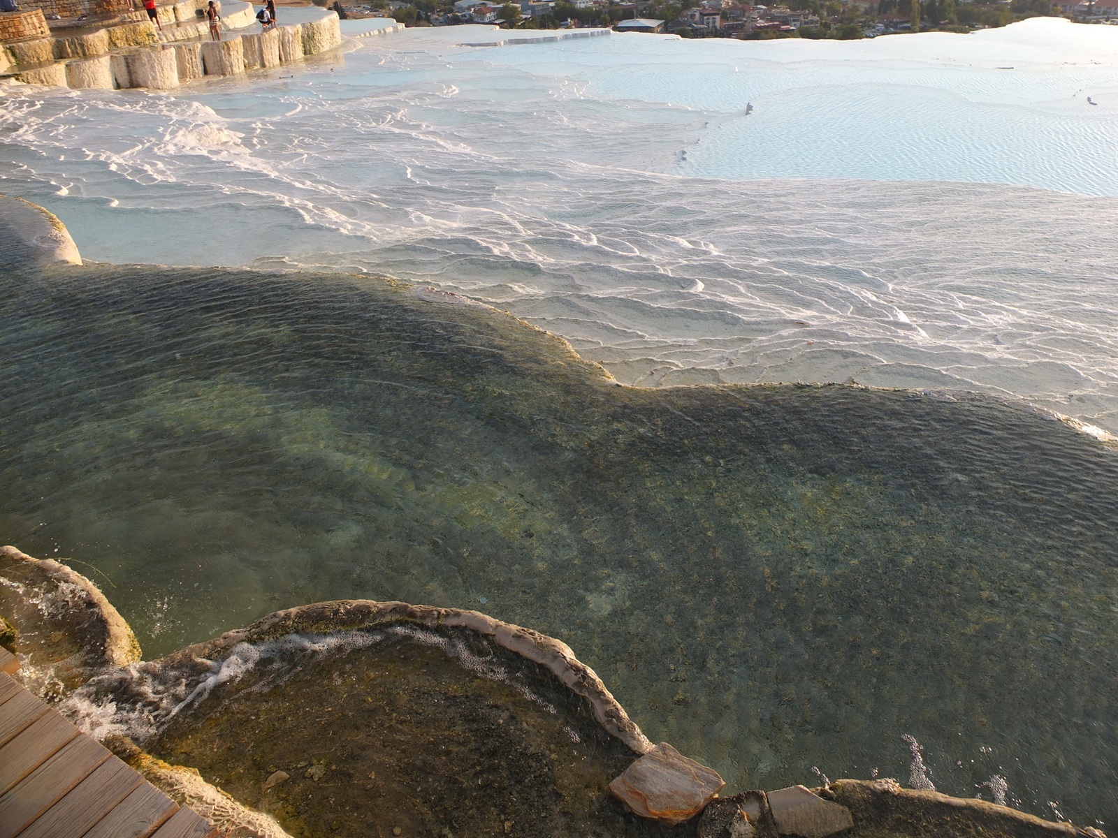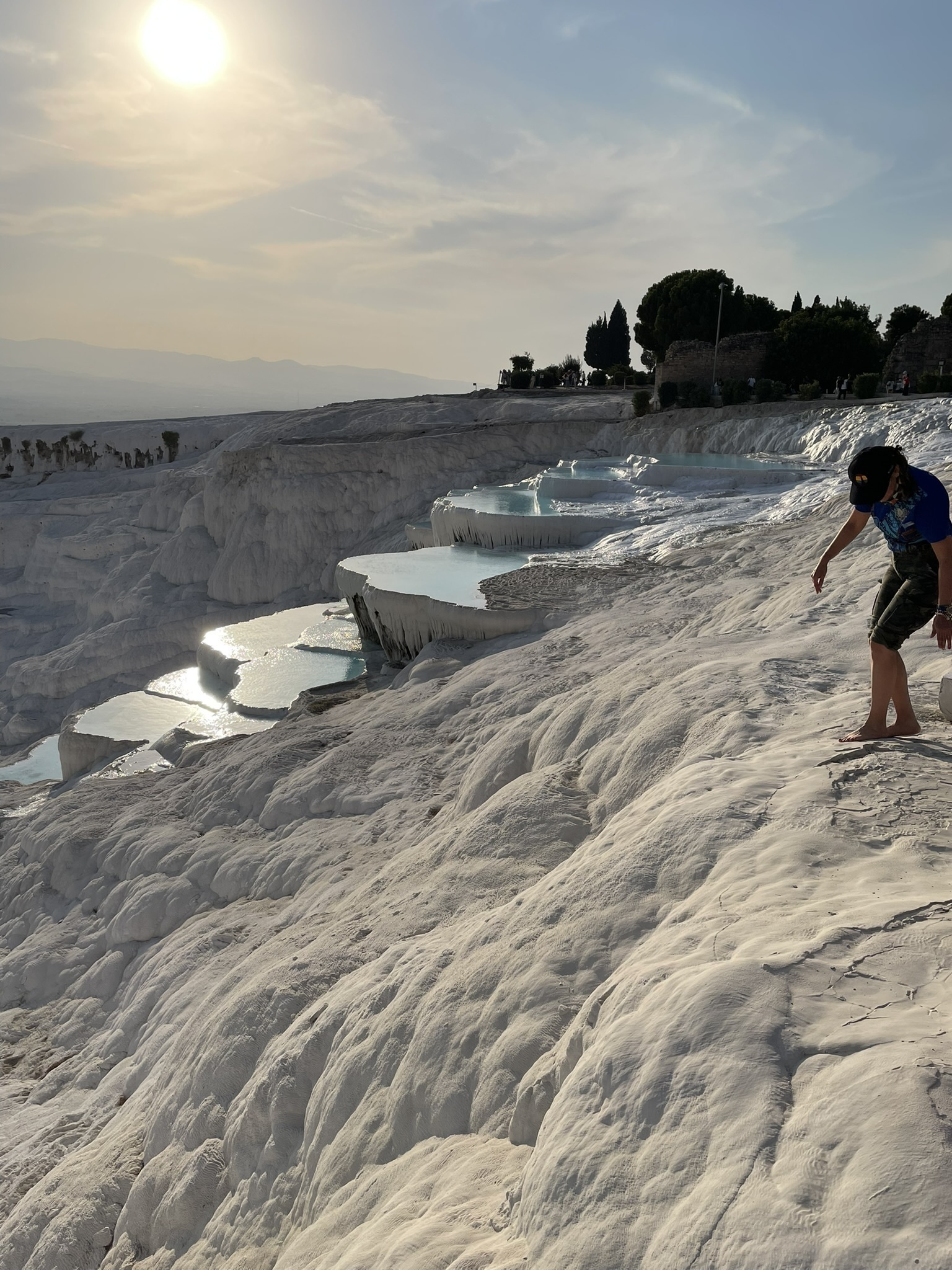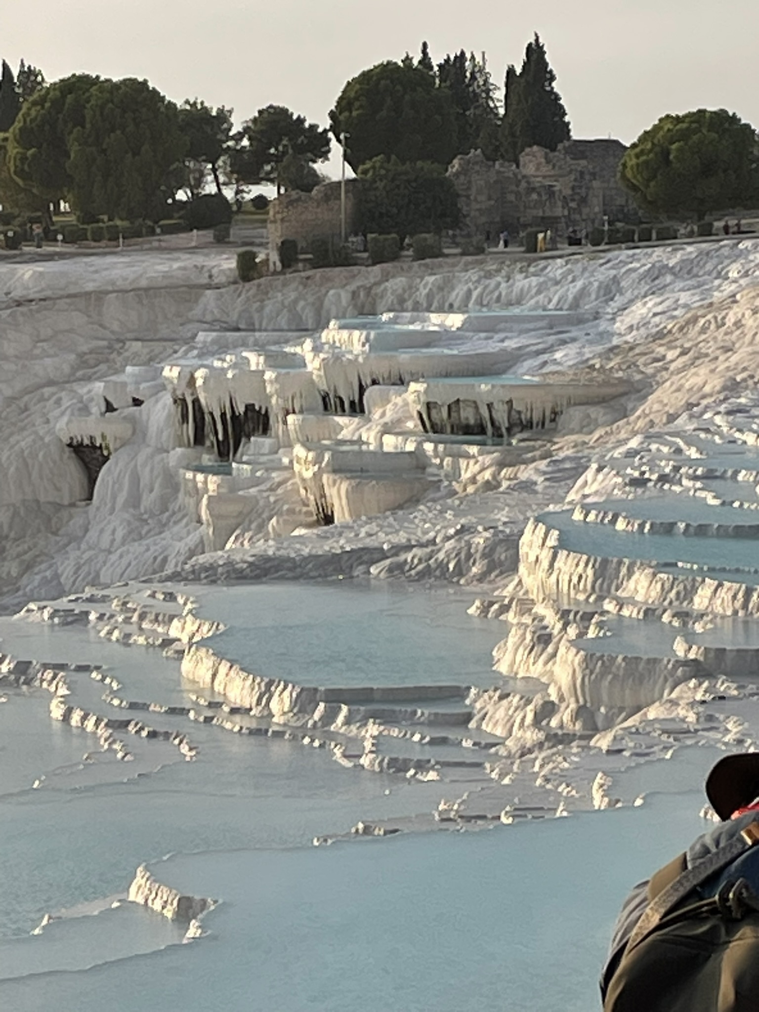 遺跡の残る大地を10分ほど歩き、パムッカレの段丘に到着。すでに夕方の5時を過ぎていたので、ちょうど夕日が当たってきれい!でも、手前の方は、水が無いときの影響か、白くないところが目立つ。