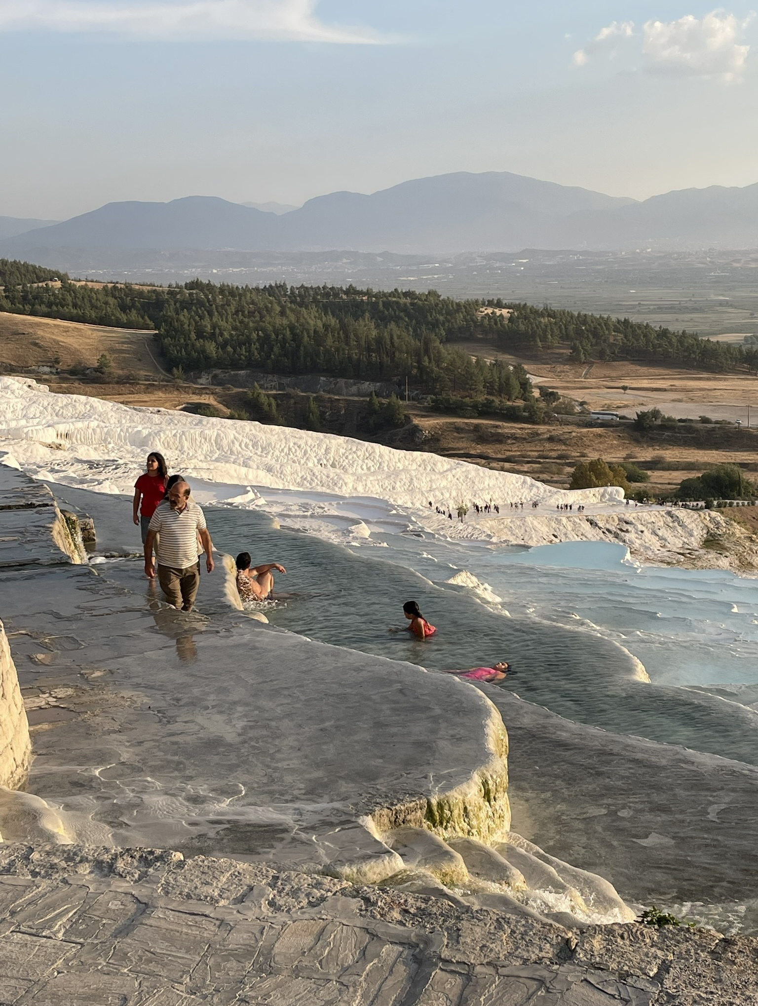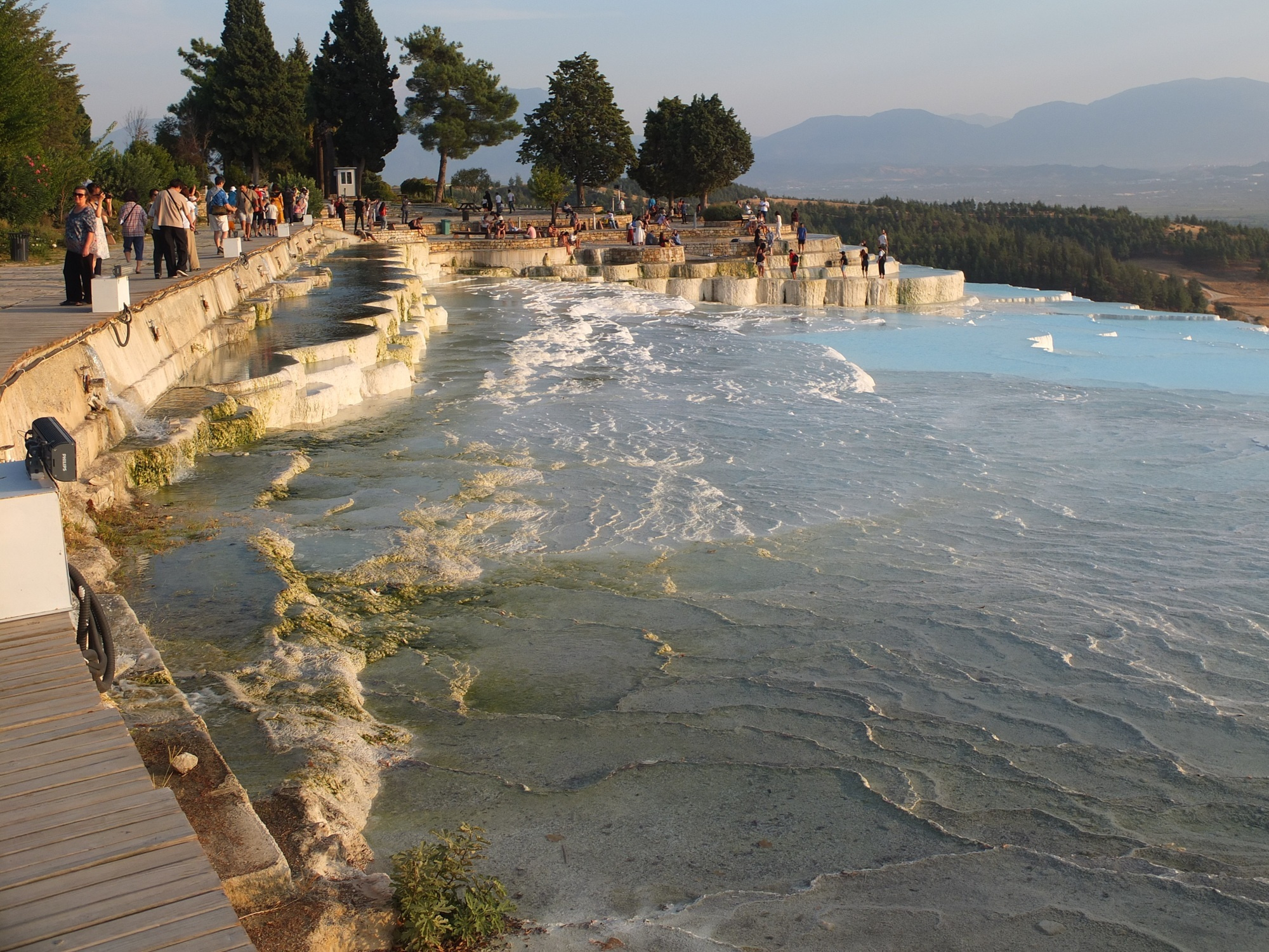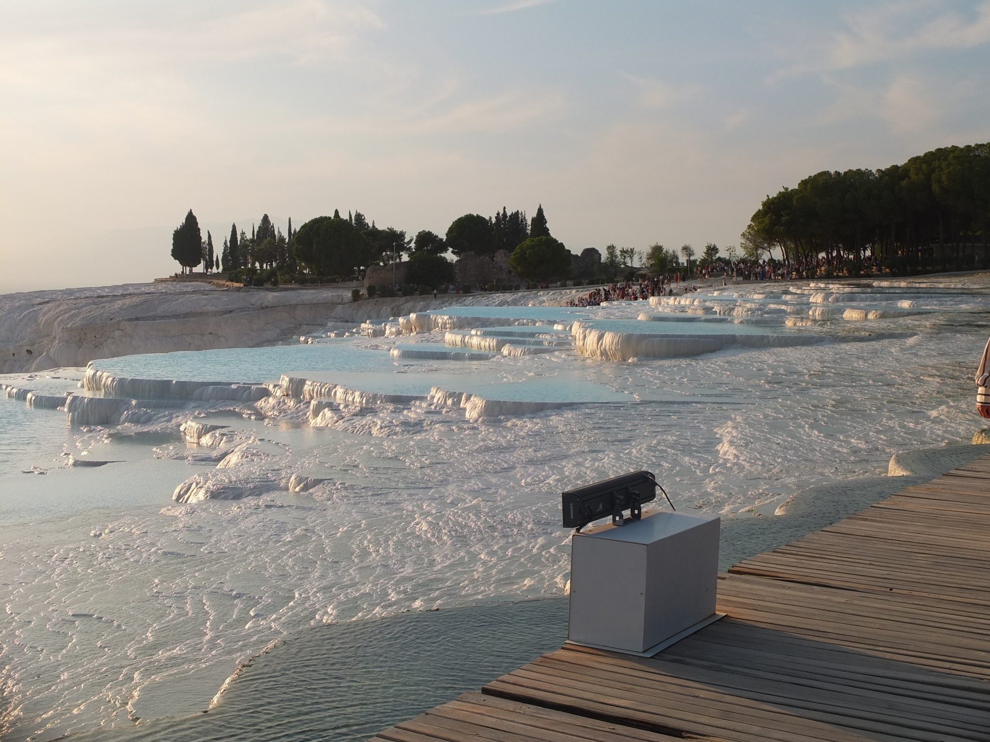 遺跡の残る大地を10分ほど歩き、パムッカレの段丘に到着。すでに夕方の5時を過ぎていたので、ちょうど夕日が当たってきれい!でも、手前の方は、水が無いときの影響か、白くないところが目立つ。