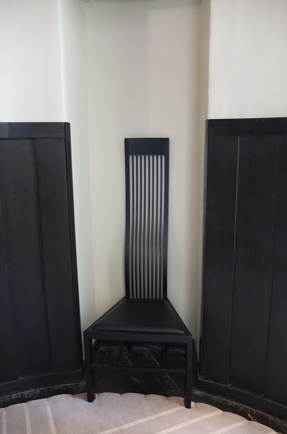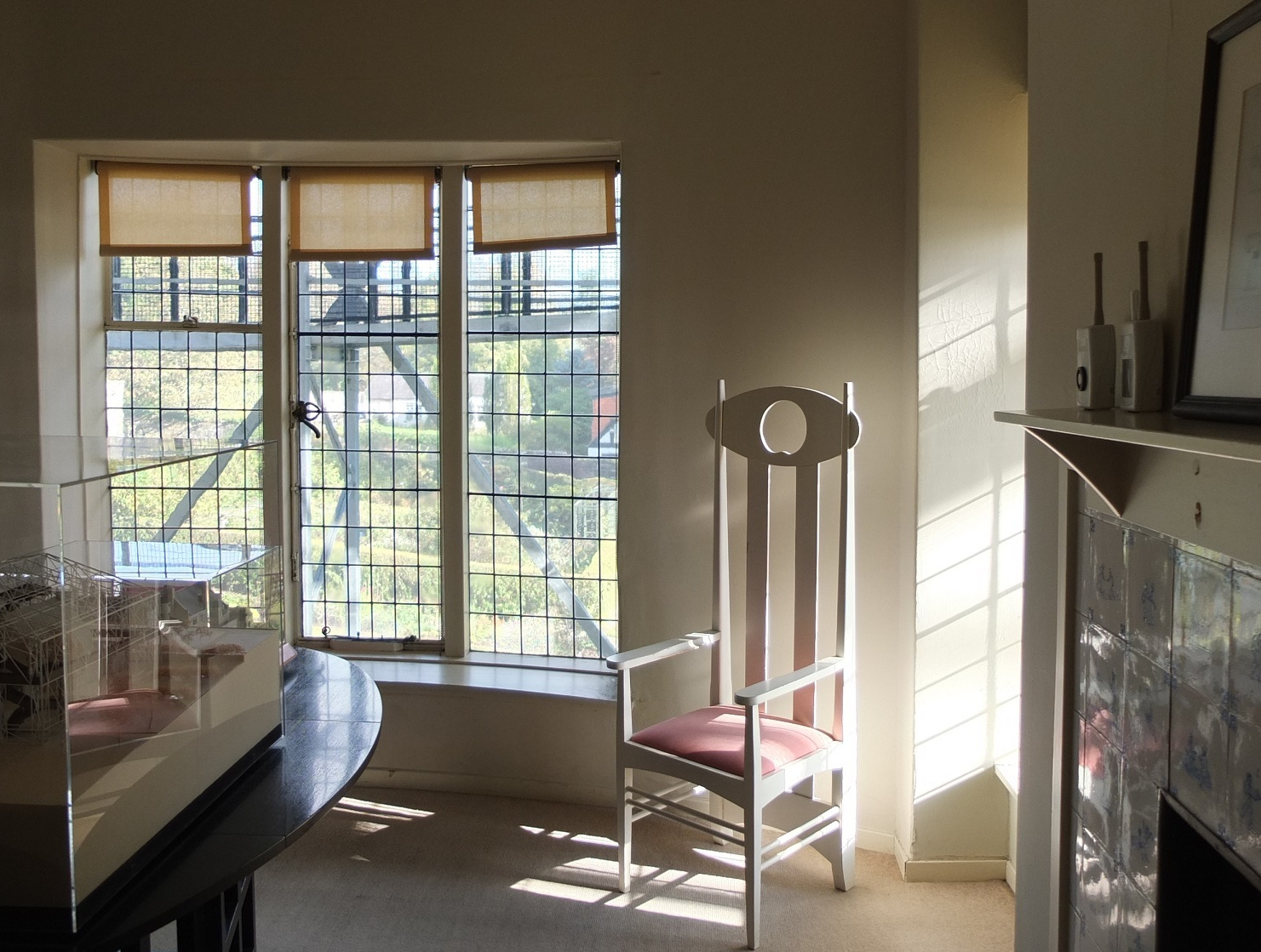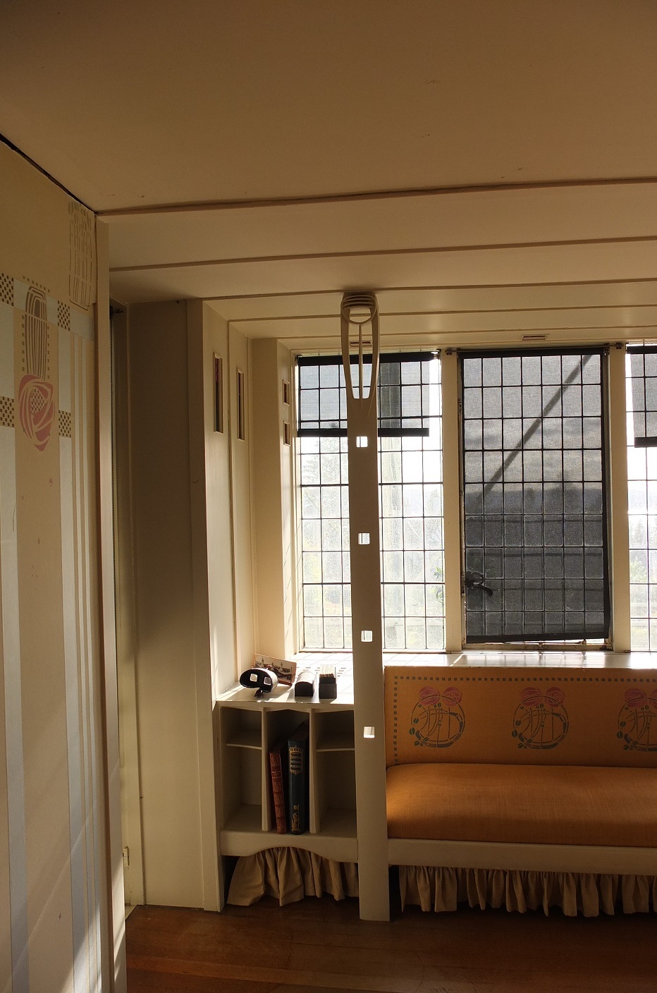 これを書きながら、ふと、持っていたマッキントッシュの写真集を見たら、この部屋の家具・装飾部分から上と天井が黒かった!あれ?おかしい!違う!と思い、ネットで調べてみたけれど、わからなかった。本は2002年に発行されたものなので、その間に現在のような白い天井になったのだろうか?どちらがオリジナルなんだろうか・・・因みに、本に載っていた平面図も若干違う。