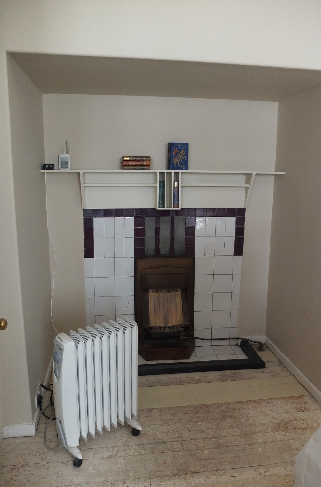 ベッドの足元側のスペース。暖炉、化粧台(?)収納が有る。暖炉の横には小さなにっちのソファが有り、ここで暖をとったり、くつろいだりしたのだろうなぁ…