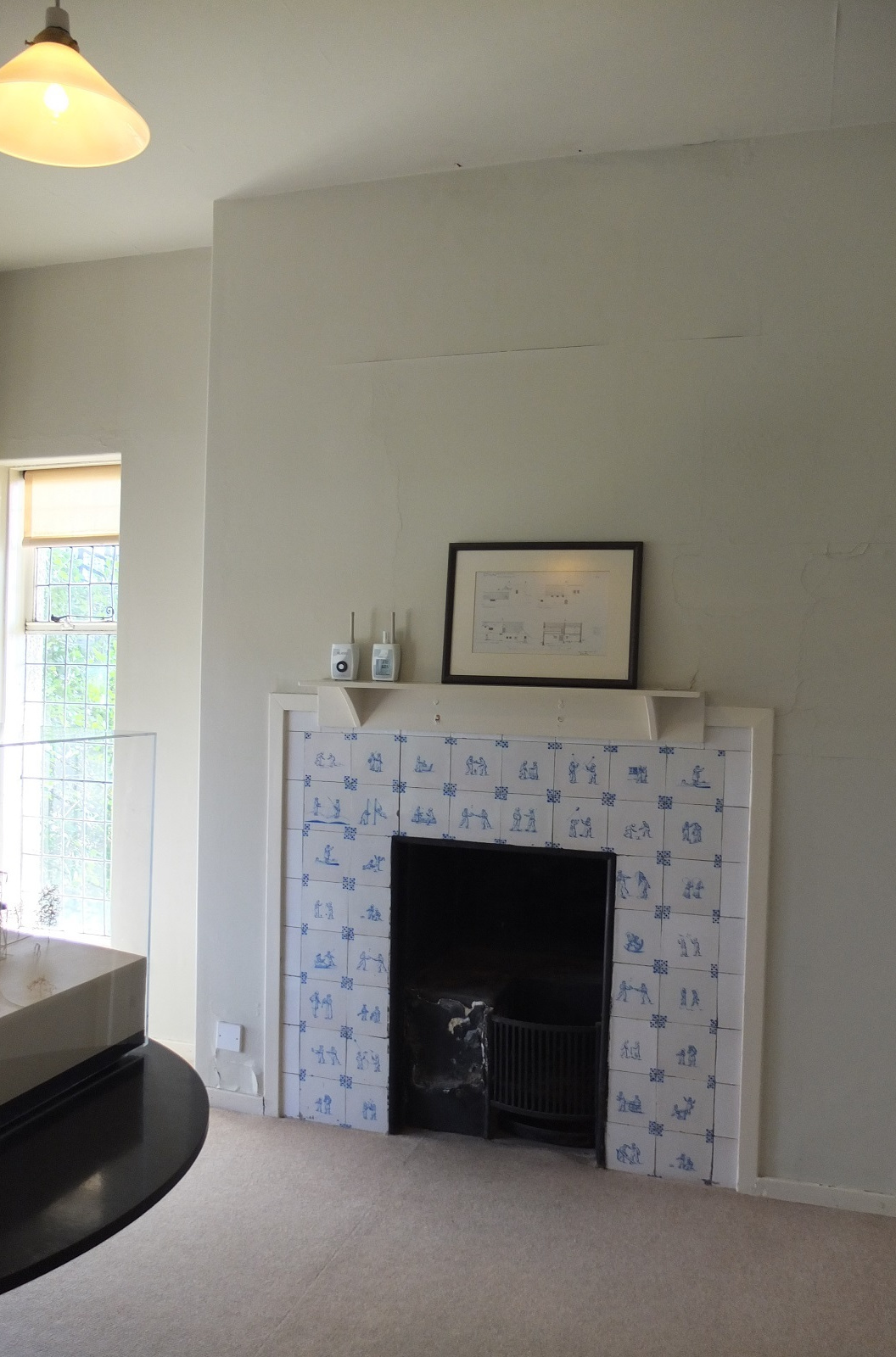 壁を凹ませた中に組み込まれた暖炉。サイドの棚もきっちりデザインされている。よく見ると、暖炉の装飾、左右対称ではないことがわかる。マッキントッシュはなぜか左右対称に見えるところを必ずちょっと崩している。しかも、よく見ないと気が付かないように。