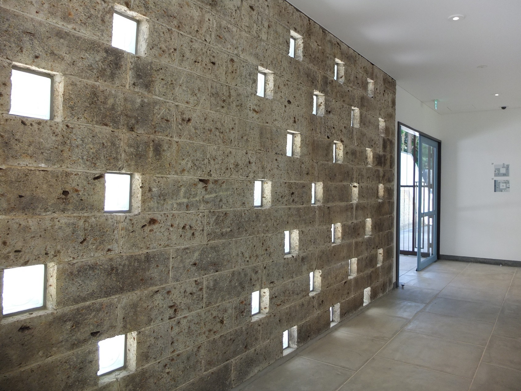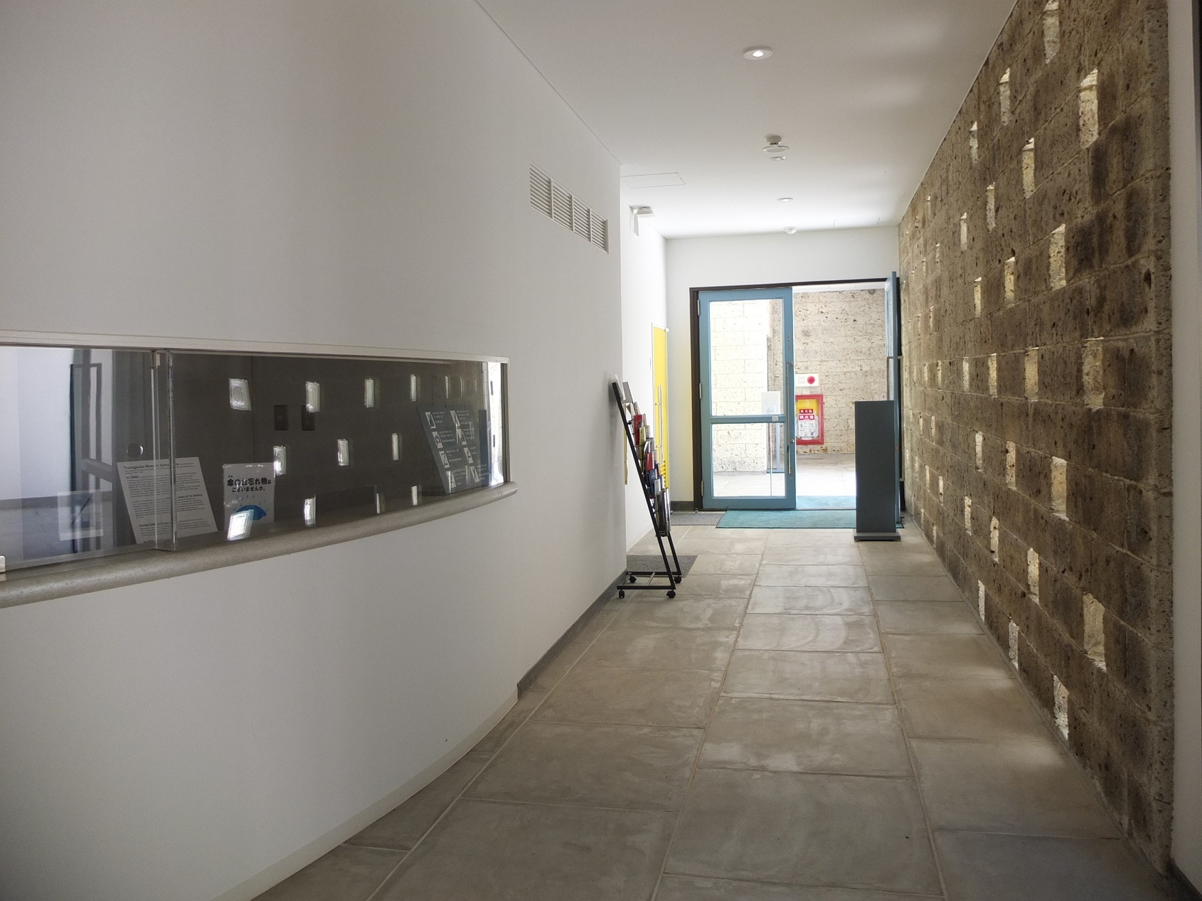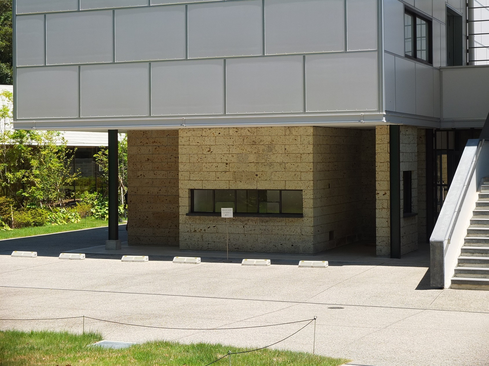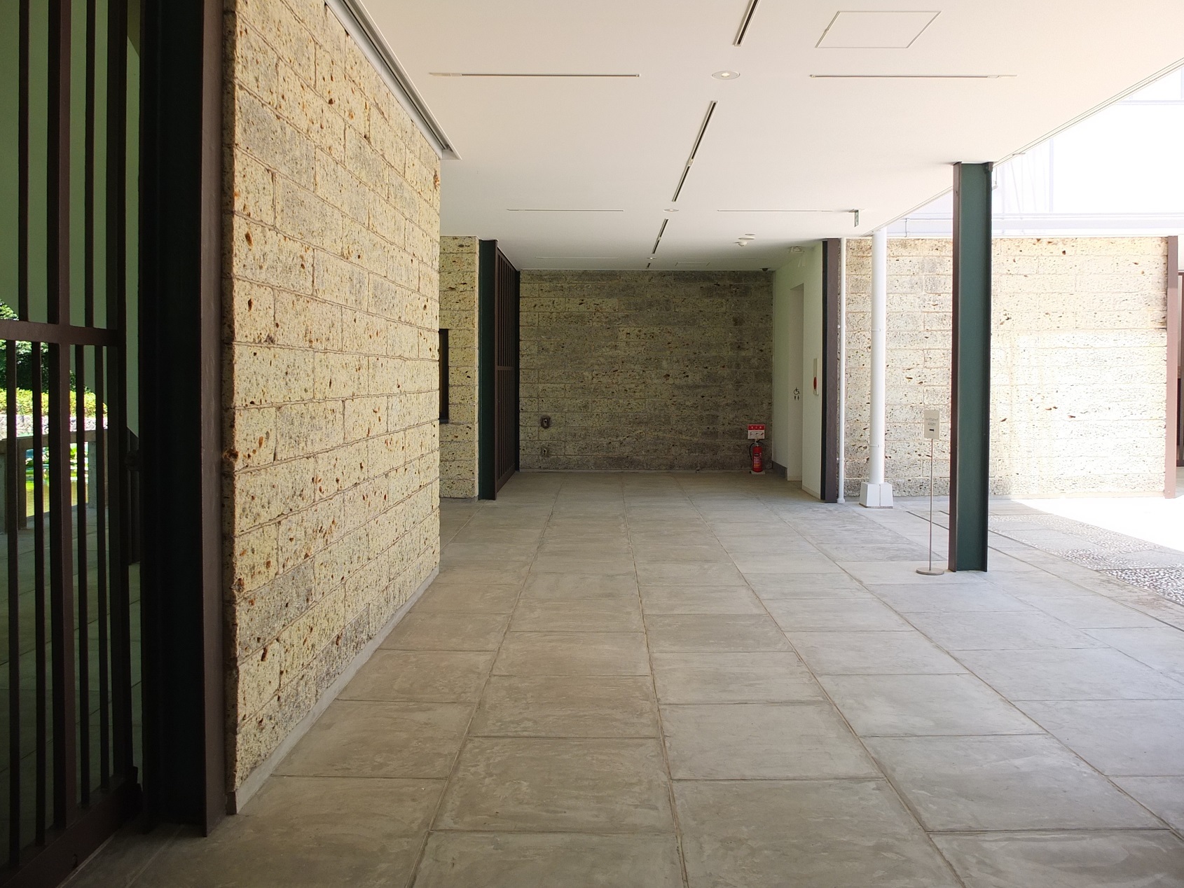 中庭と回廊を隔てる壁は大谷石。この壁も穴あき。穴の部分にガラスブロックが入った部分もあるが、受付のある空間と中庭を仕切るこの壁は穴のまま。鉄格子といい、この壁といい、仕切りたくないんだなぁ・・・天気の悪い日はどうする?・・・まぁ、壁の無い部分が半分あるから、もういいか・・・って?