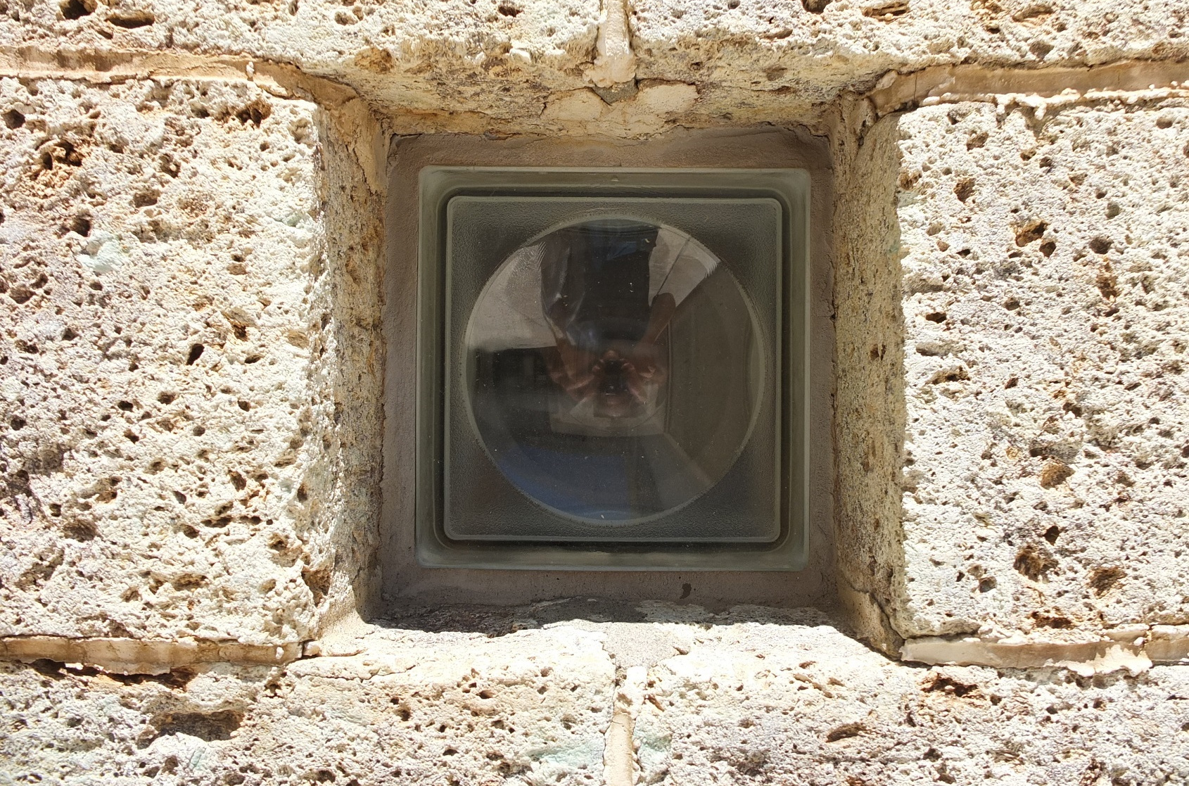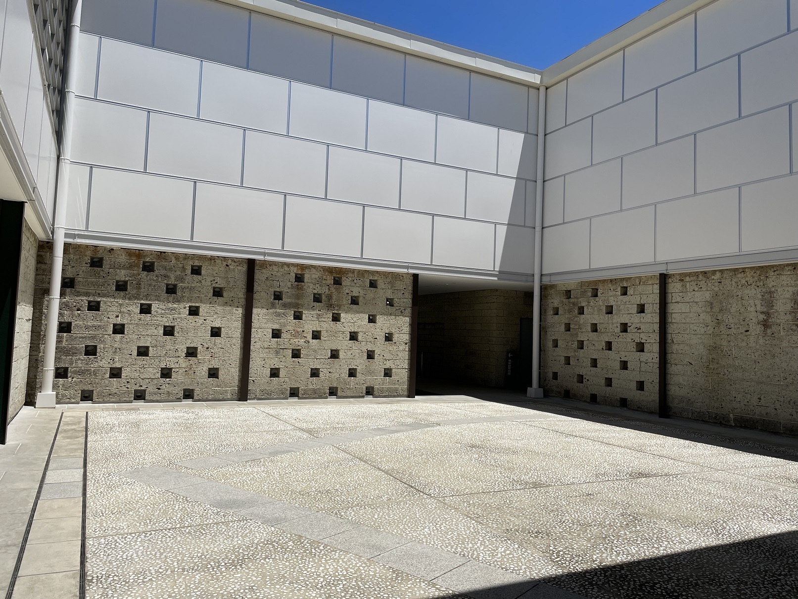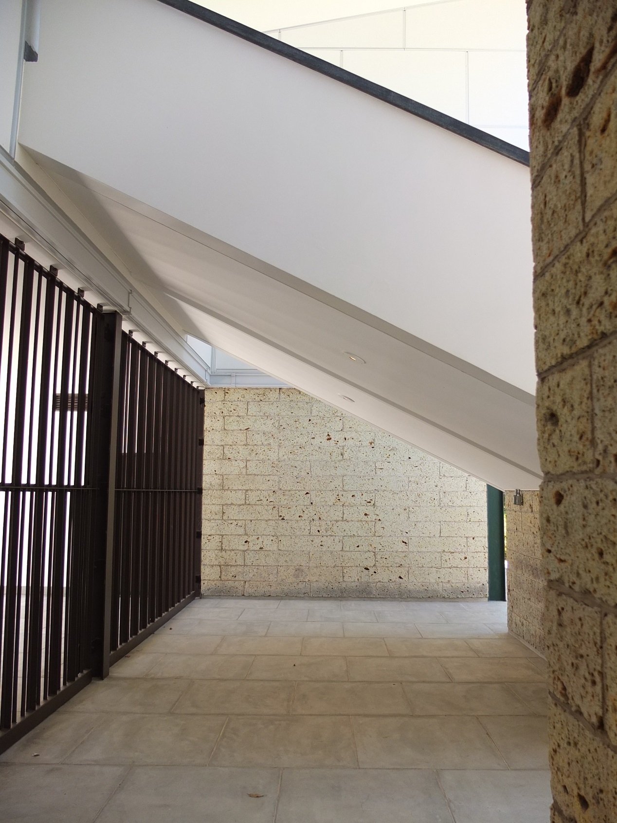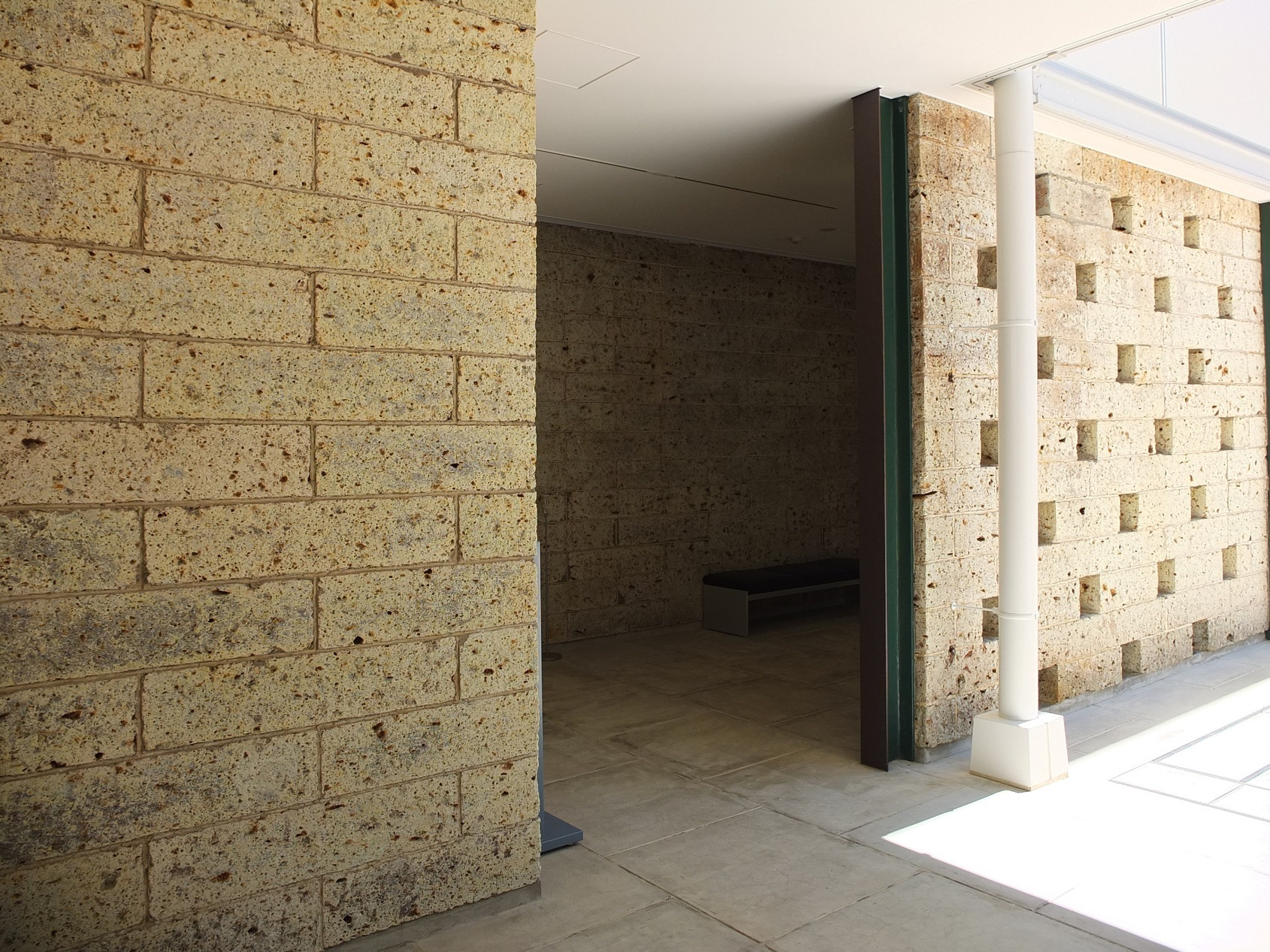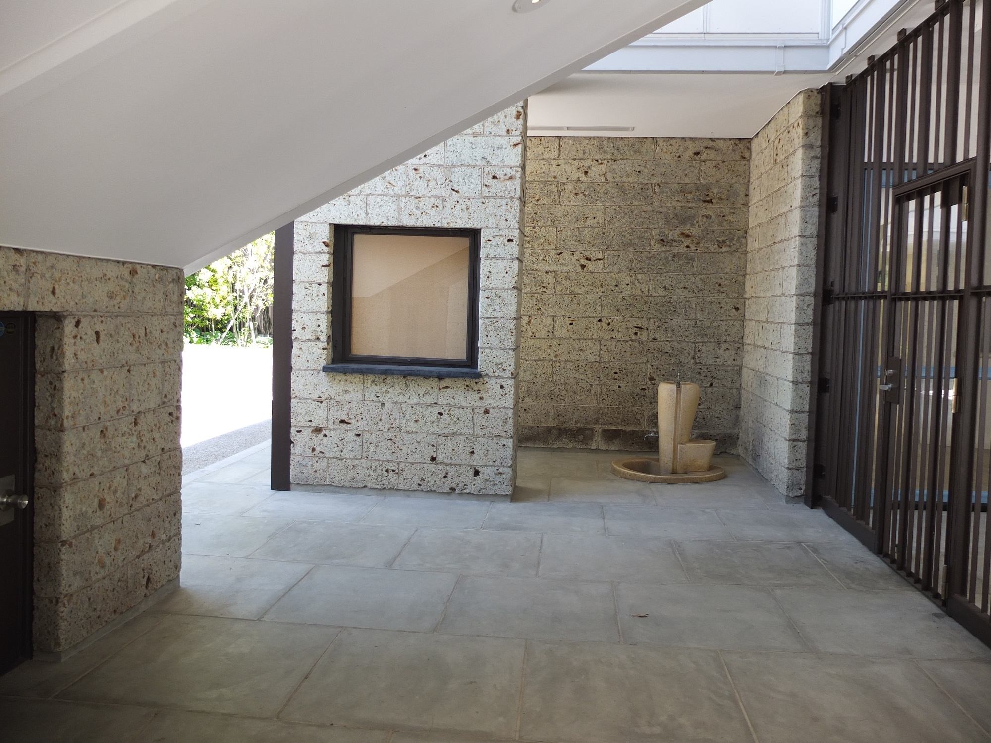 中庭と回廊を隔てる壁は大谷石。この壁も穴あき。穴の部分にガラスブロックが入った部分もあるが、受付のある空間と中庭を仕切るこの壁は穴のまま。鉄格子といい、この壁といい、仕切りたくないんだなぁ・・・天気の悪い日はどうする?・・・まぁ、壁の無い部分が半分あるから、もういいか・・・って?