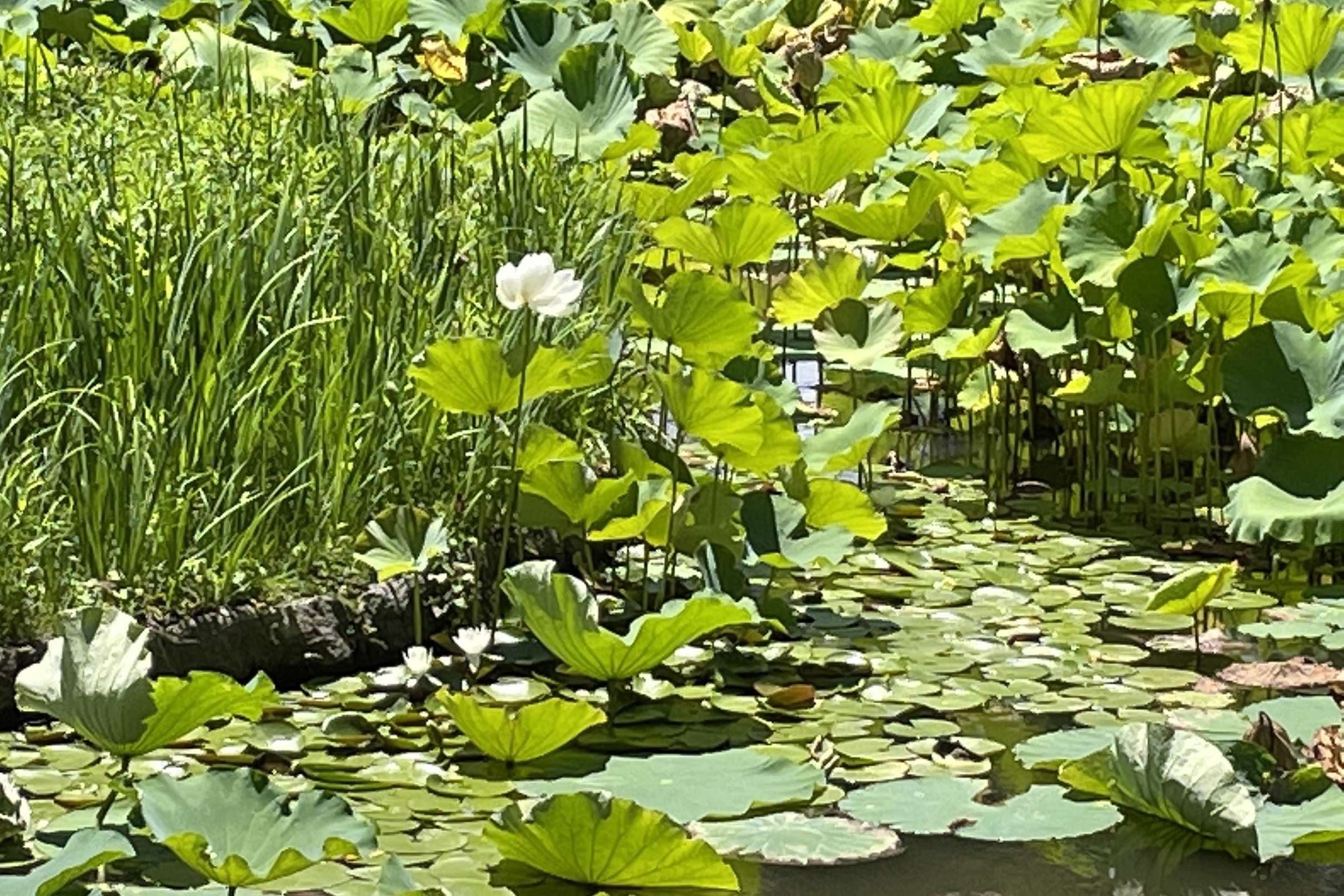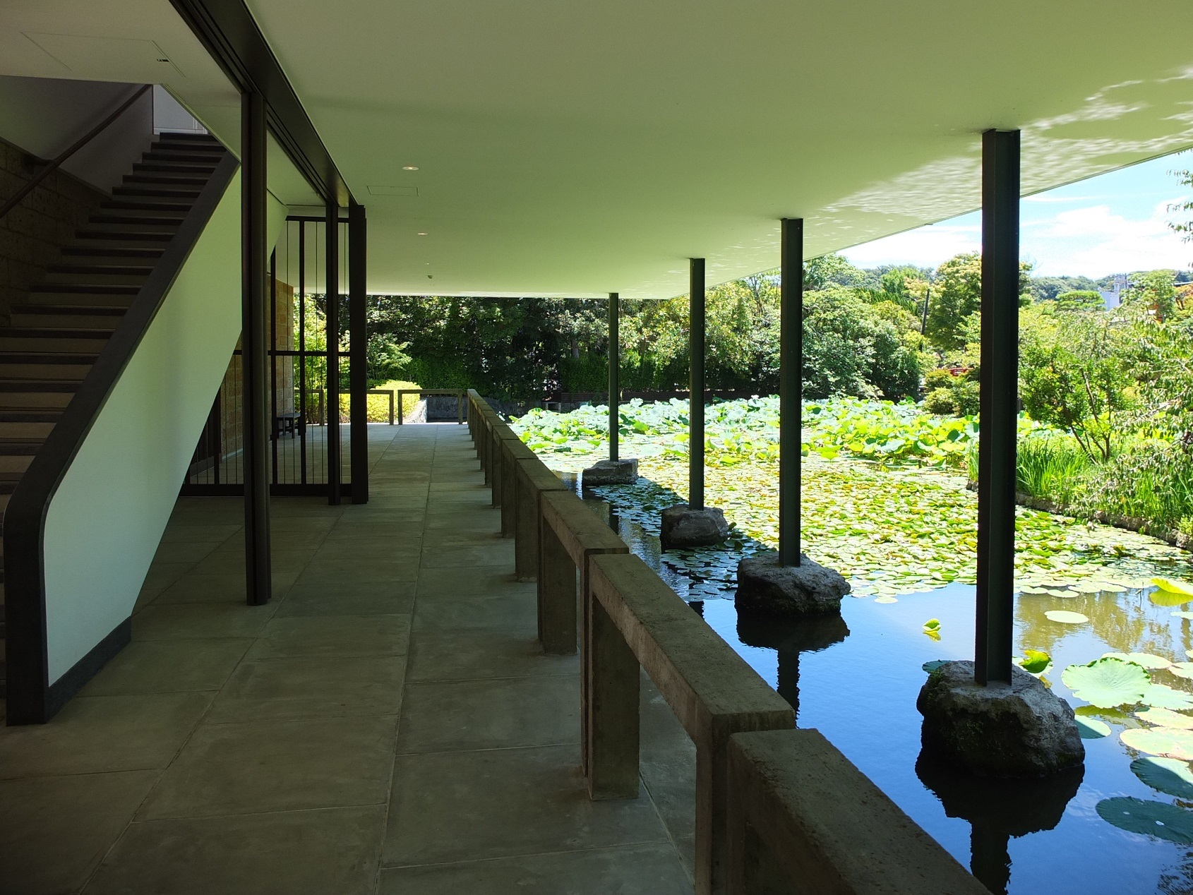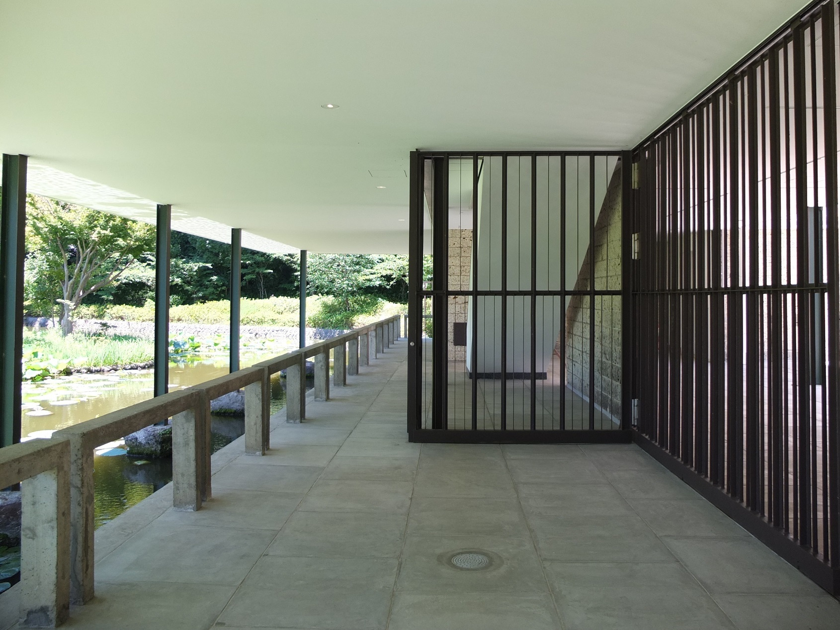 中庭の回廊の反対側、池に面した通路。この季節は、蓮の花が咲いていて、張り出した天井に映る水の文様がきれいだった。一日中、ここでぼんやりとして過ごしたくなる空間だ。