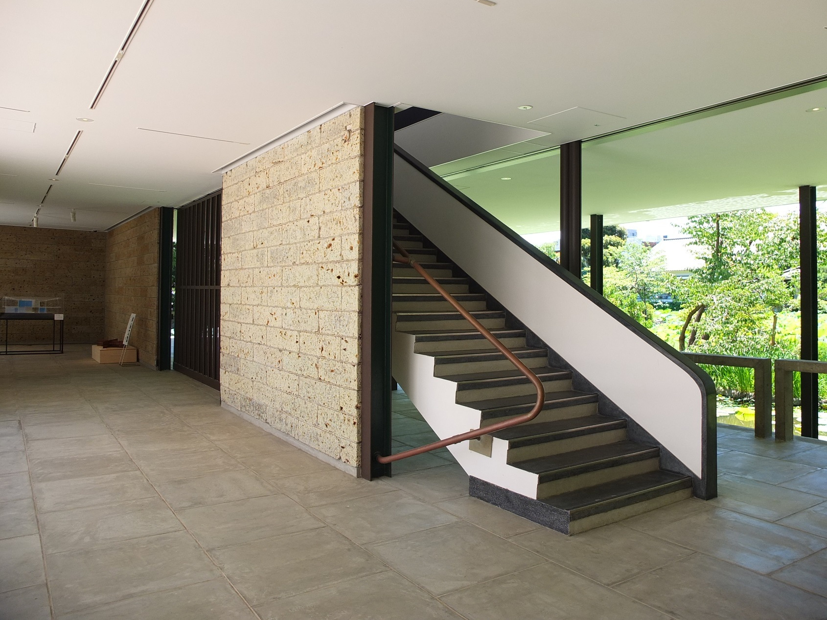 中庭を囲む回廊と蓮池側の通路の間に、2階への階段がある。大谷石の壁からちょっとはみ出し、さりげなく「ここ!」と示してくれている。端っこではなく、正面でもないこの場所にあるのは何とも憎い!あ~、でももともとは2階から入っていくのだったから、展示を見終わった人がこの階段で下に降りた時、中庭を目にするよう考えてたのかなぁ・・・