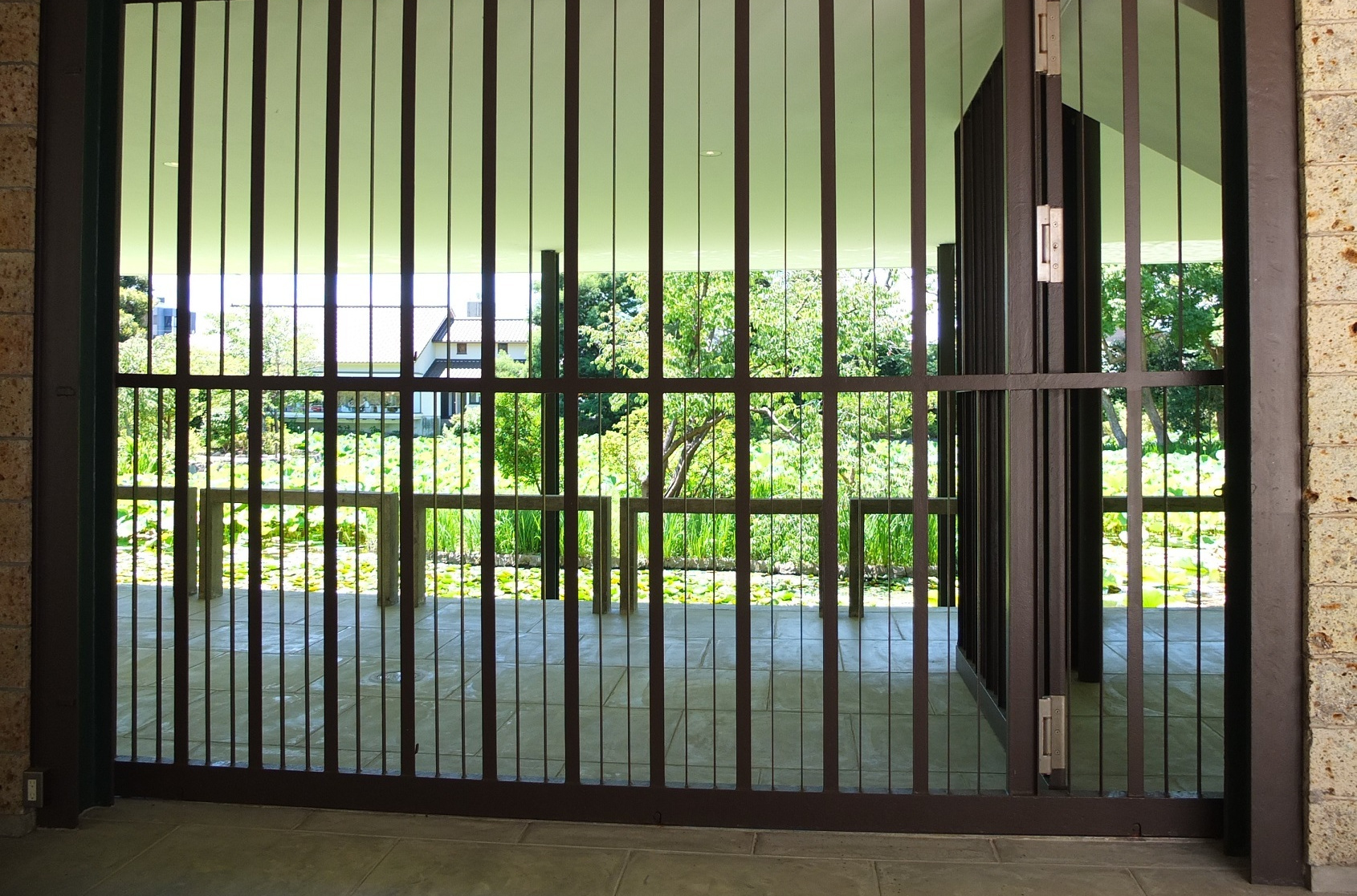 中庭を囲む回廊と蓮の池(平家池)側の通路を仕切る鉄格子。太めの鉄棒と細い鉄棒を交互に配した軽快な鉄格子だ。仕切る必要があったのか、でも仕切りたくなかったのか・・・でも、この格子があった方が面白い^^