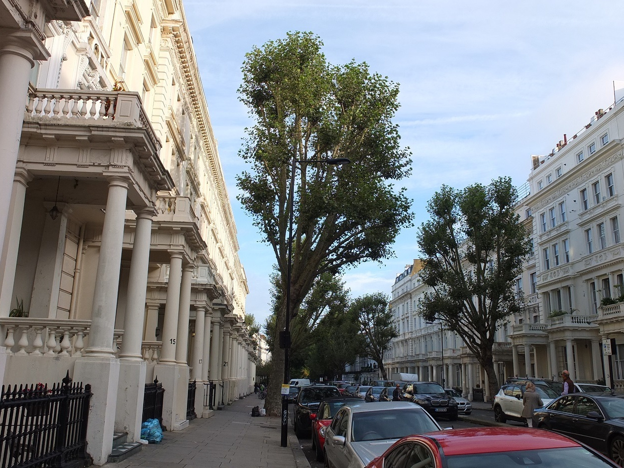 観光に出かける前にホテル周辺を見て回った。この辺りは、イギリスといえばこんな感じというような、半地下を備えたマンションのような建物が立ち並び、それぞれが工夫を凝らしながら(中にはそうでないものもあるが)使っているようだった。20数年前に来た時とそんなに変わらない風景。ただ、あの時に泊まったホテル周辺は、もう少し道路が狭く、なんとなく親しみやすい感じだった気がする。