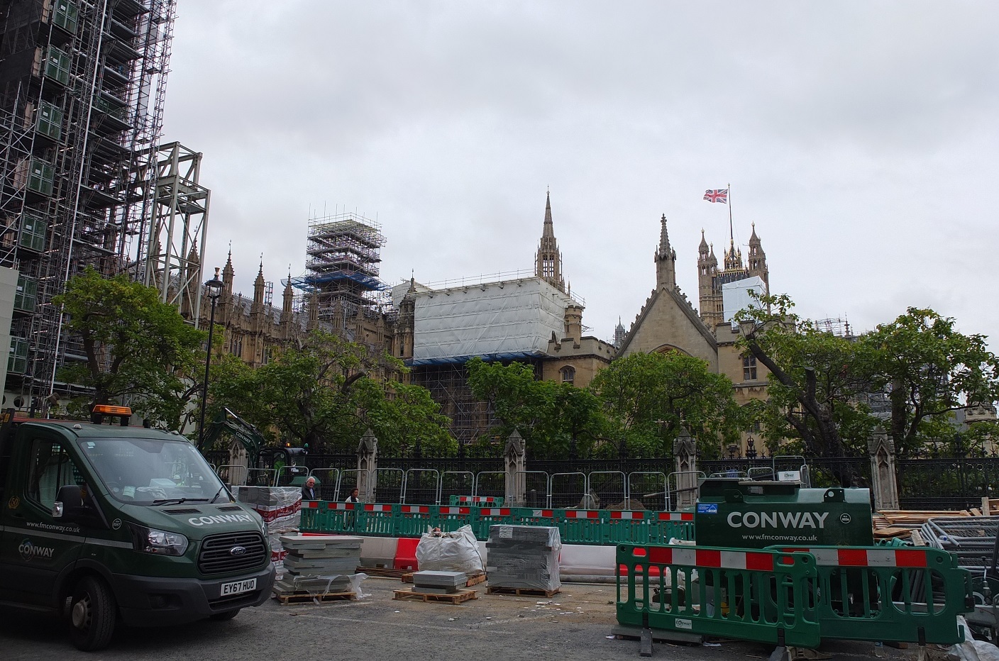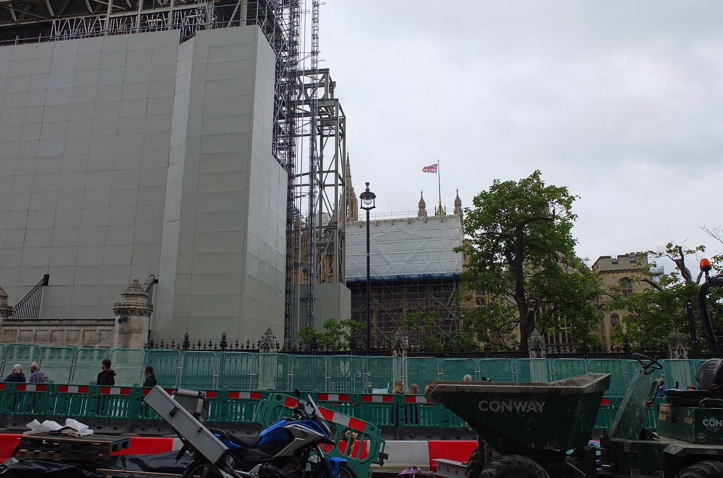 2日目の始まりはビッグベン(国会議事堂)から。ウェストミンスター駅を出るとすぐ目の前に出てくる。しかし、今は改修工事中でこんな姿。
