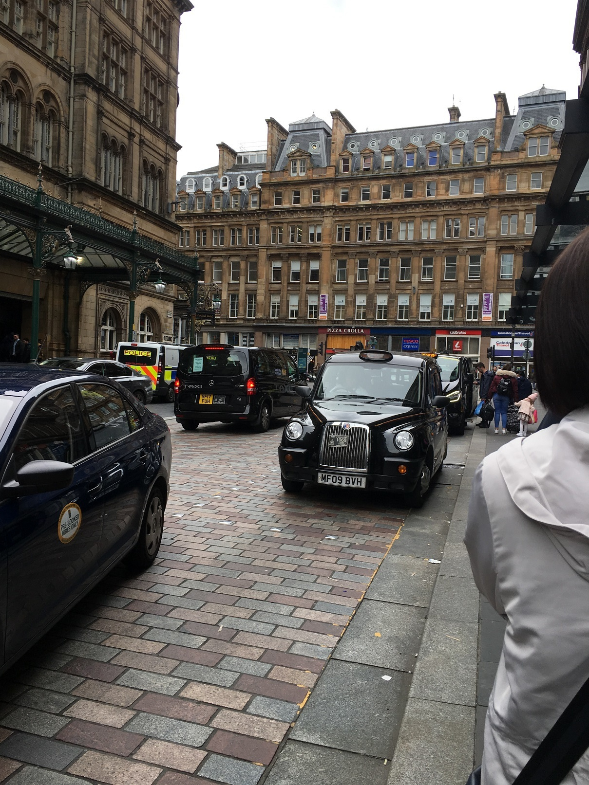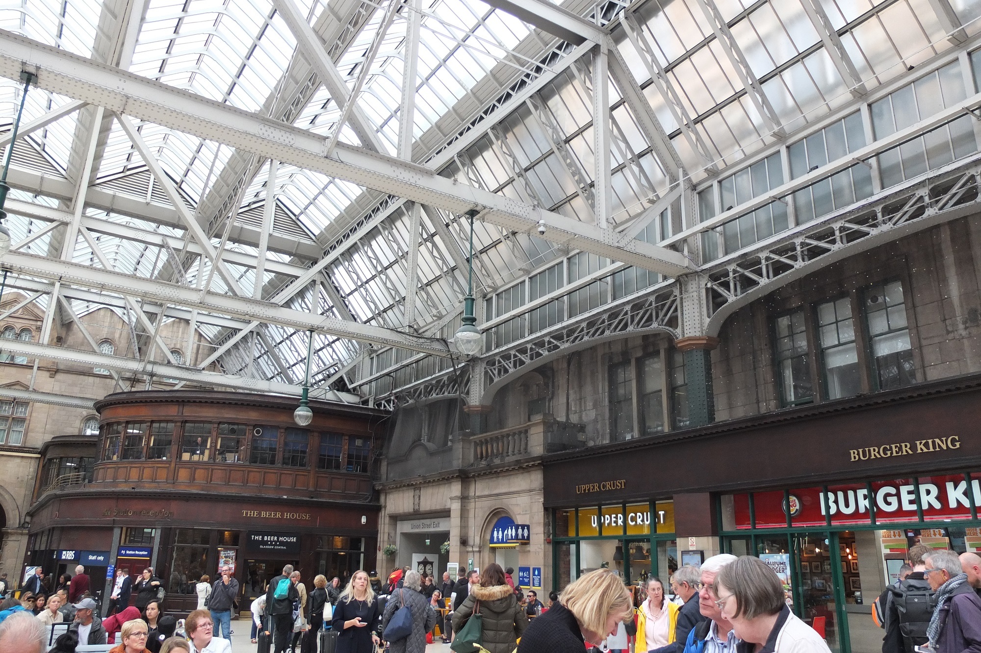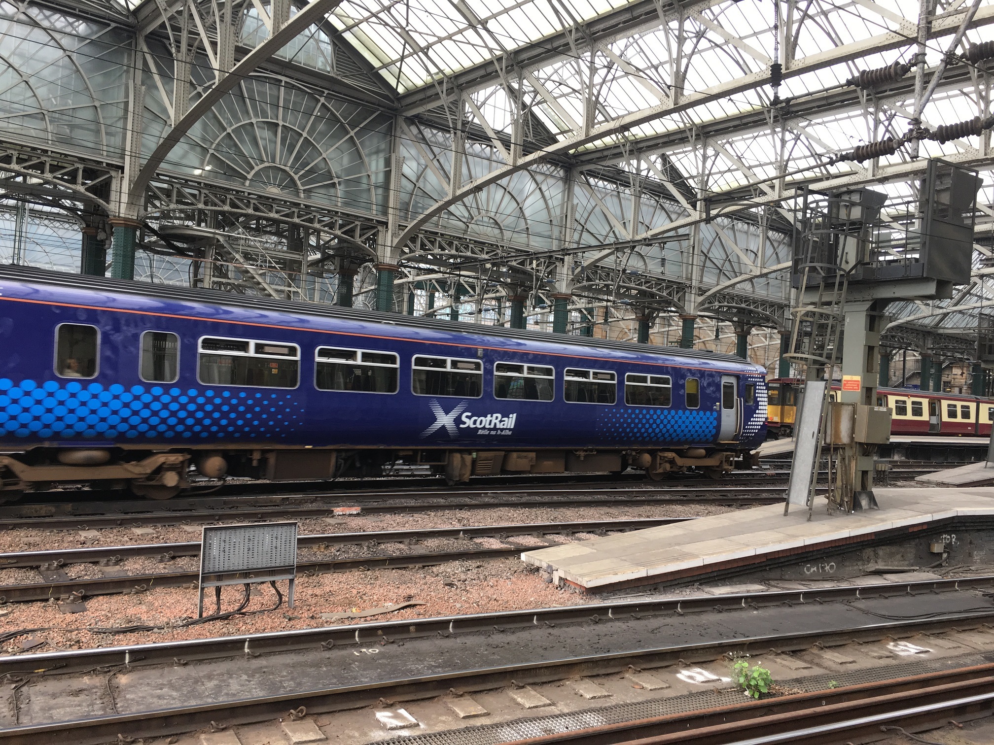 ガラス張りの屋根のホームに列車が滑り込み、グラスゴーセントラル駅に到着。いかにも外国に来た!という感じの駅。産業革命の頃に建設されたんだろうかと思わせる造りだ。