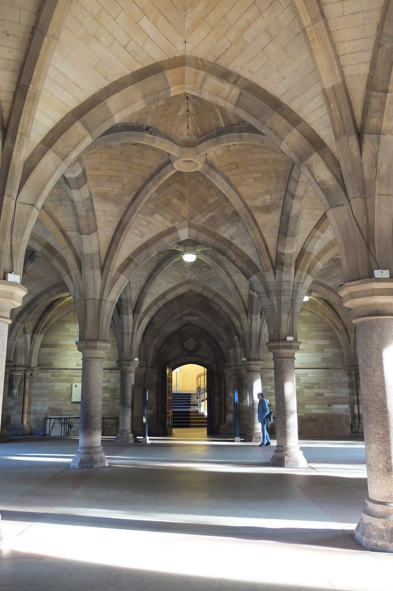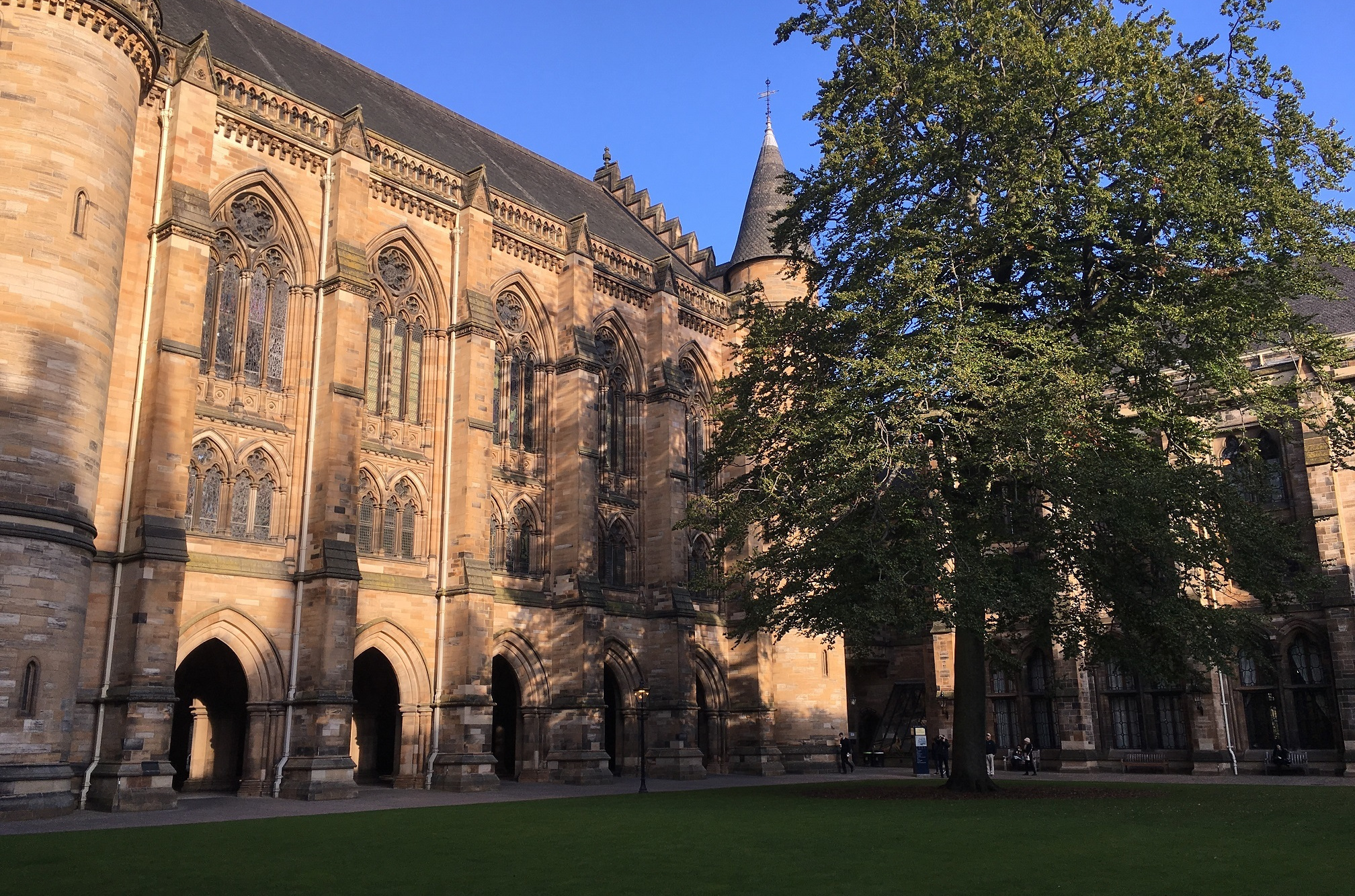 今日は公園の中を歩いてグラスゴー大学へ向かう。途中、ツートンカラーの鳩位の大きさの鳥がいたり、川が流れていたりと、朝の散歩にはちょうどいい^^。公園を抜けると、目の前に大学の建物が!すでに敷地内?!車がたくさん駐車している。学校関係者の車だろうか?
