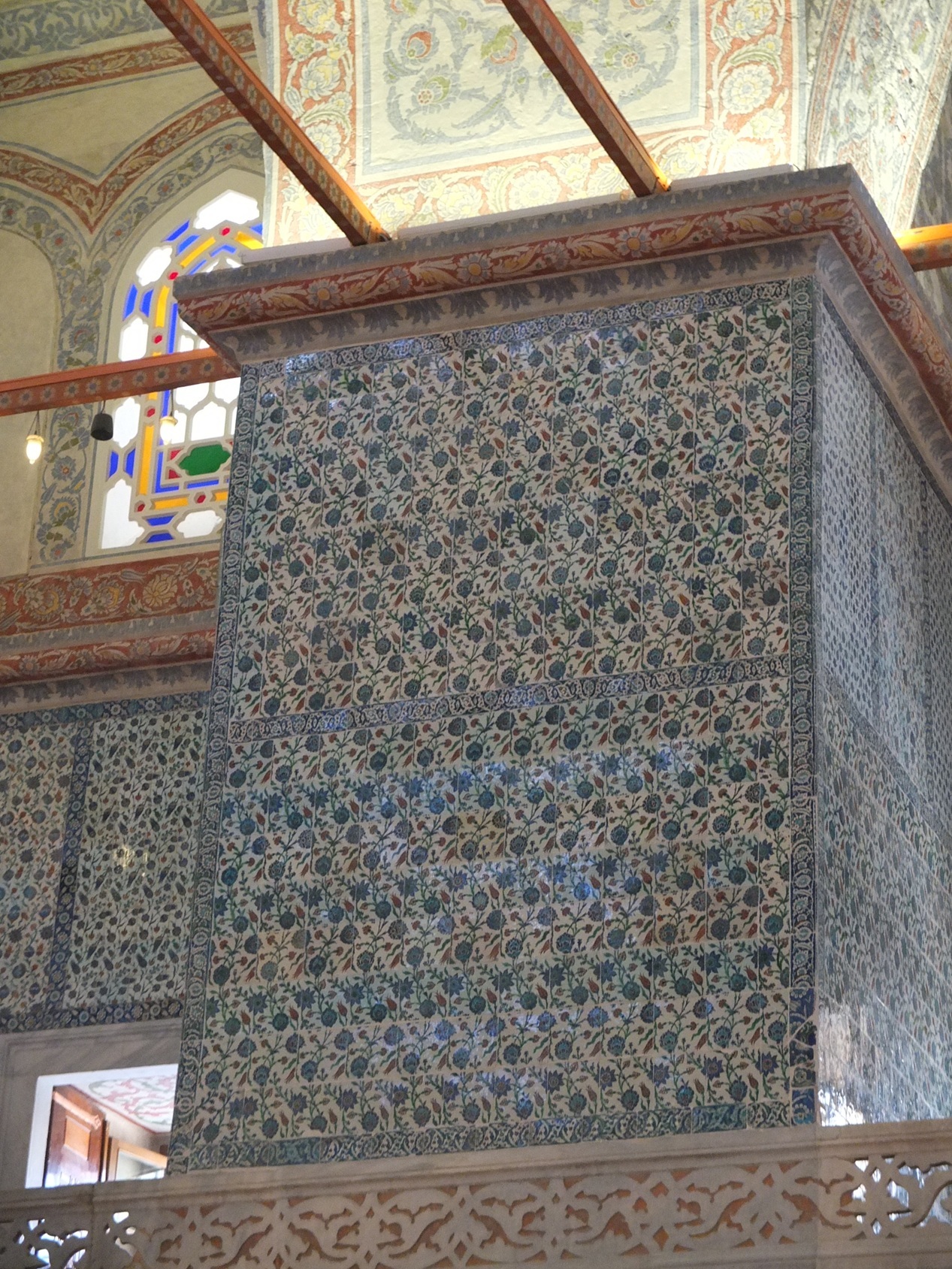 さて、気付かれただろうか、思ったより青く無い。青いイズニックタイルが2万枚以上使われているというが、全体的にはそれ以外の色のタイルや装飾が多いせいか、規模自体も大きいので、ブルーの割合は3~4割にも満たない感じ・・・2階の壁部分はほぼブルーのタイルだけど・・・