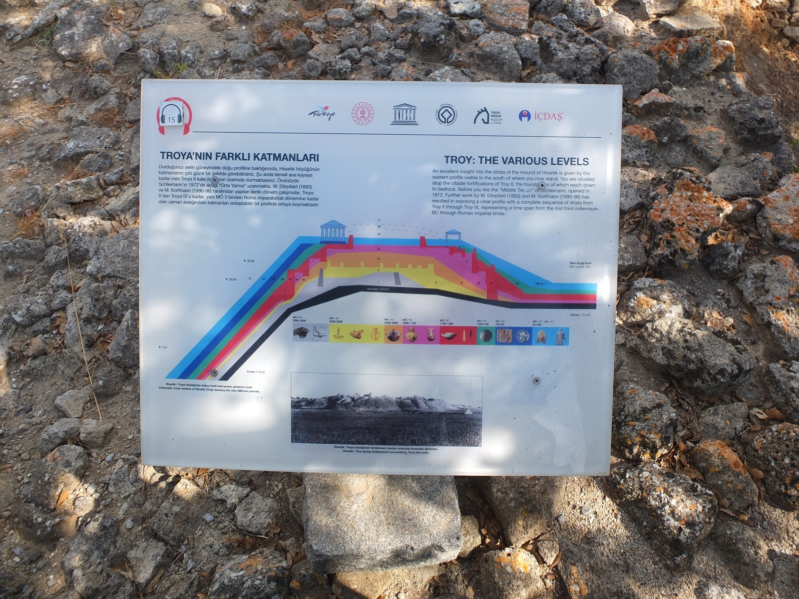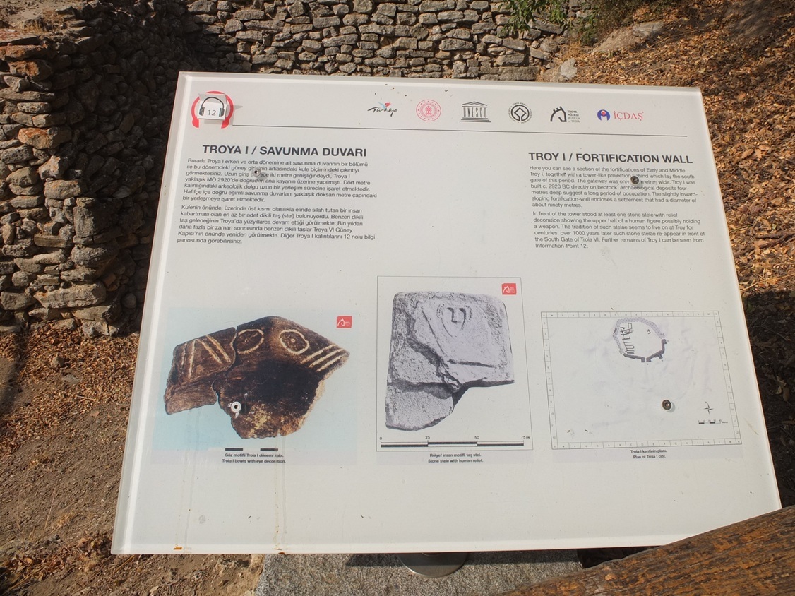 トロイのあの有名なお話はもちろんご存じだと思うが、あの話は作り話だと思われていたところが、一人のドイツ人シュリーマンが絶対にトロイは存在した!そこに財宝が眠っているに違いない!と、探しに探し、ついに見つけたのがこのトロイ。(*最初にこの遺跡を見つけたのはアマチュア考古学者フランク・カルヴァートだそうだ)しかし、発掘の仕方がめちゃめちゃだったため、年代がぐちゃぐちゃになってしまい、しかもひそかに発掘品を持ち帰ってしまっとか・・・なので、今まだ全容が解明されない。そもそも、街が何らかの理由で廃墟になってしまうと、そこを埋め、その上に新たな街を作るという方法がとられてきたため、何層にもなっていて(下の説明版参照)、それが混ざってしまったため、解析が困難になってしまっているそうだ。