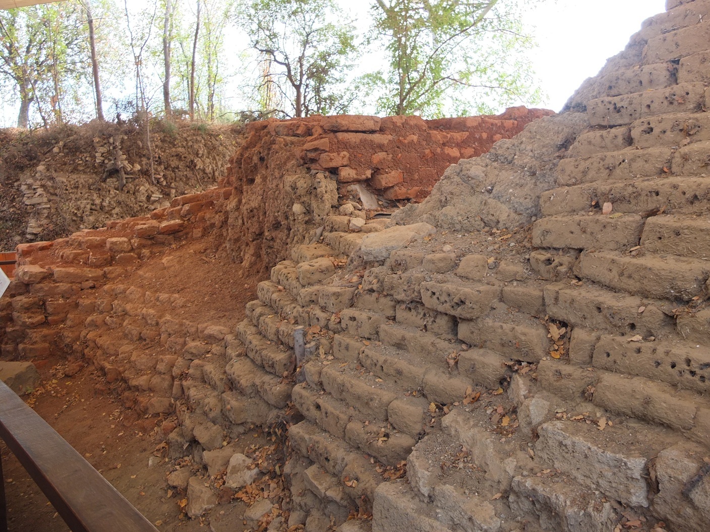 進んでいくと、煉瓦っぽい組積造の壁があった。手前の白っぽいものが遺跡で、その横の煉瓦っぽい色のものは復元らしい。