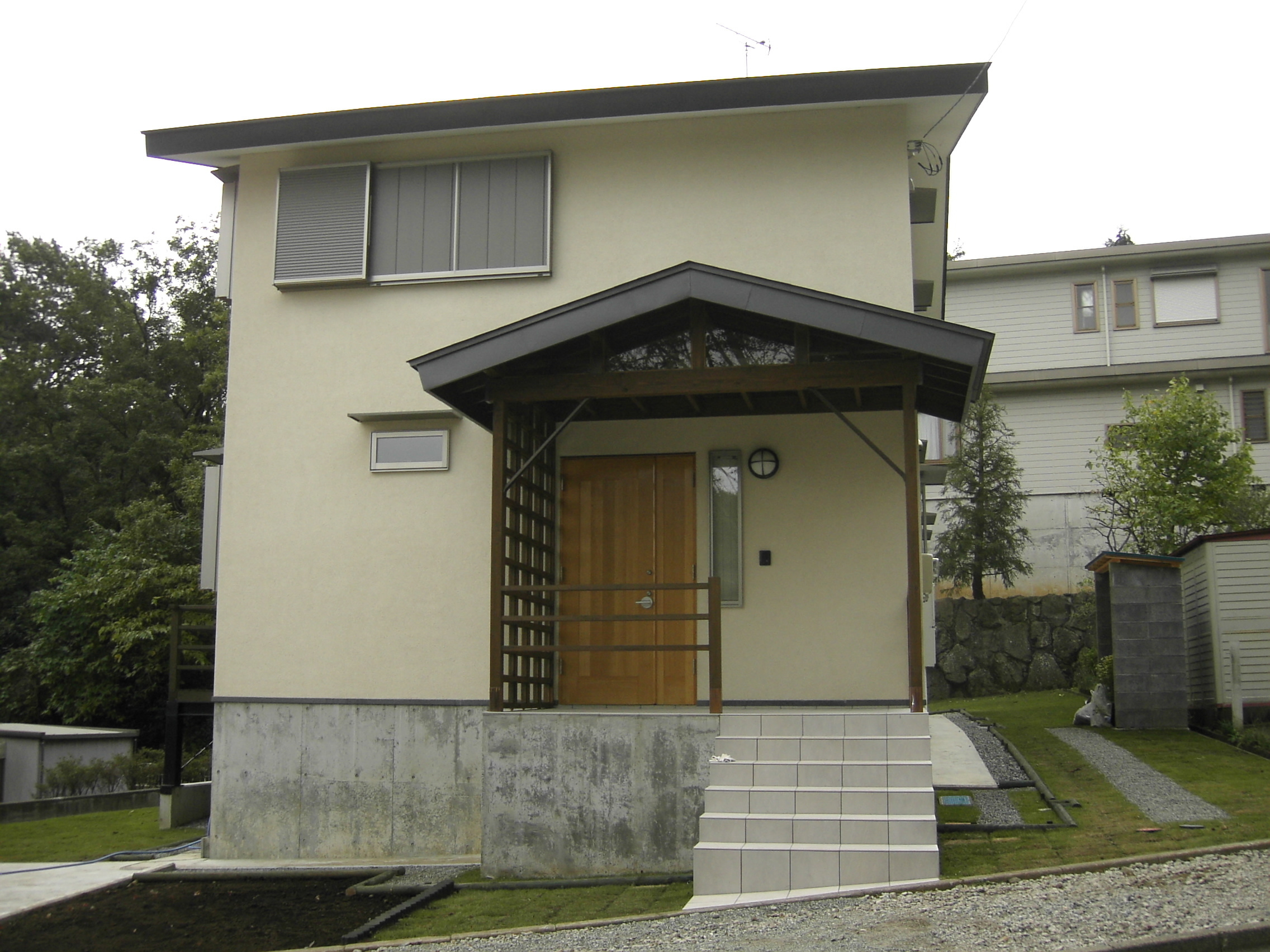 敷地に高低差があり、奥と手前で2.5mの差があった。低いほうにあわせて整地する方法もあったが、あえて自然のままの地形で点てることにした。そのため玄関前に五段ほどの階段を上がったポーチを造った。あえてフェンスを造らないということだったので、これが柔らかな境界となった。