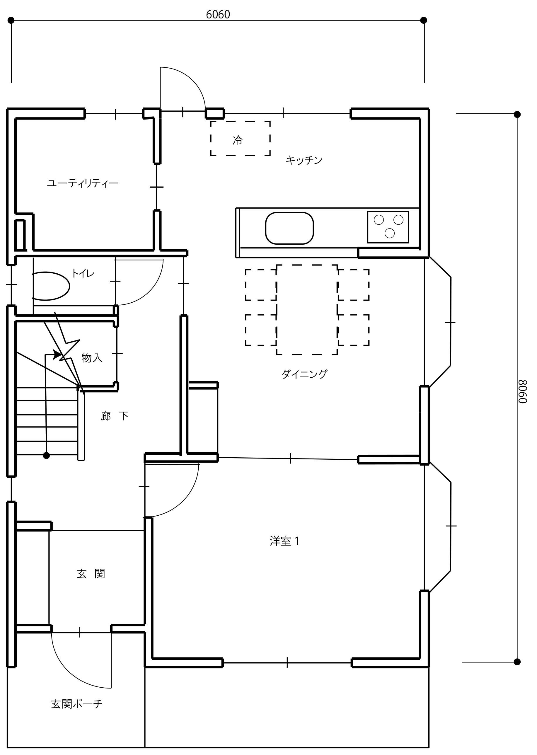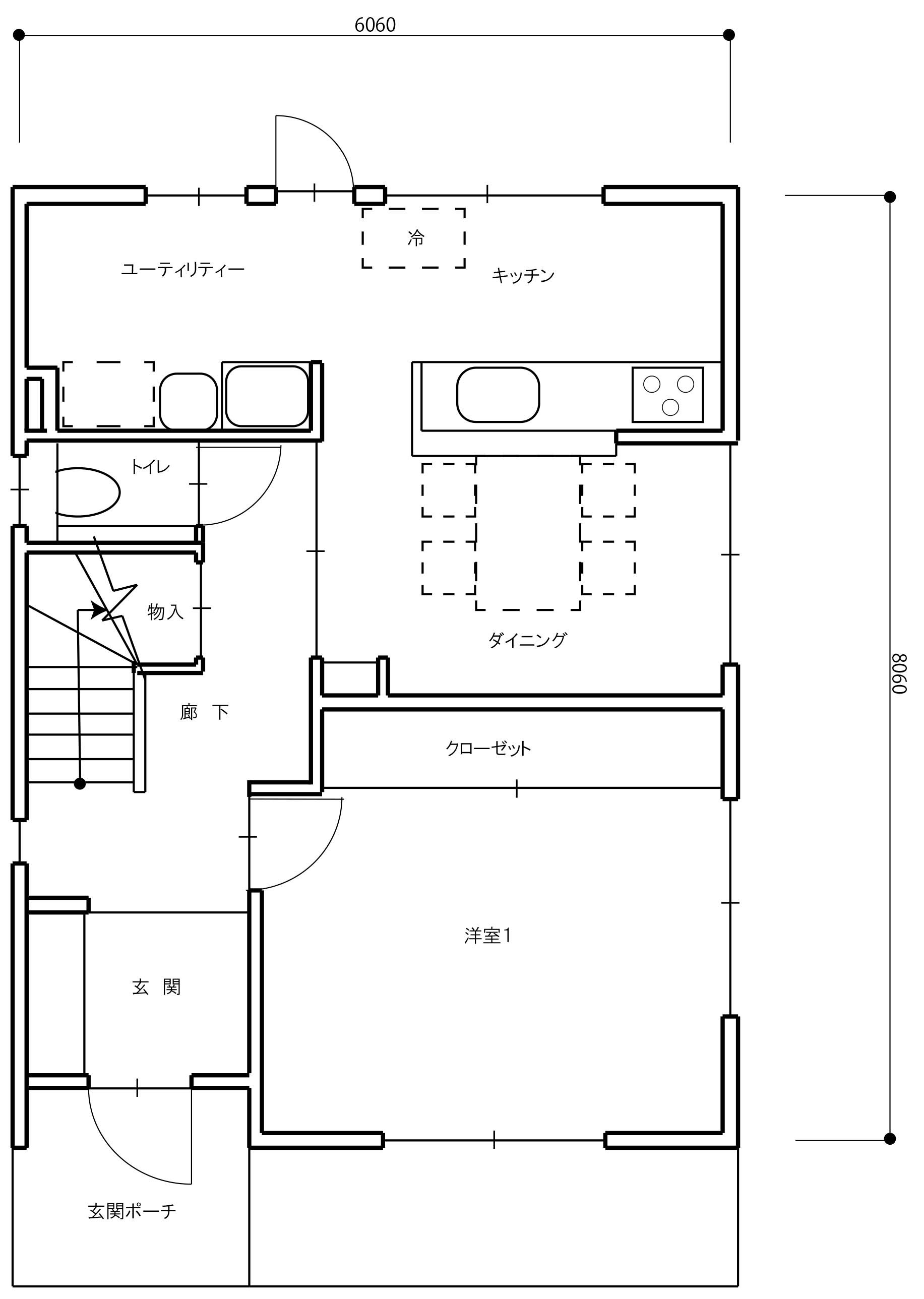 ユーティリティは結構広くとられていた。入口は折れ戸。
